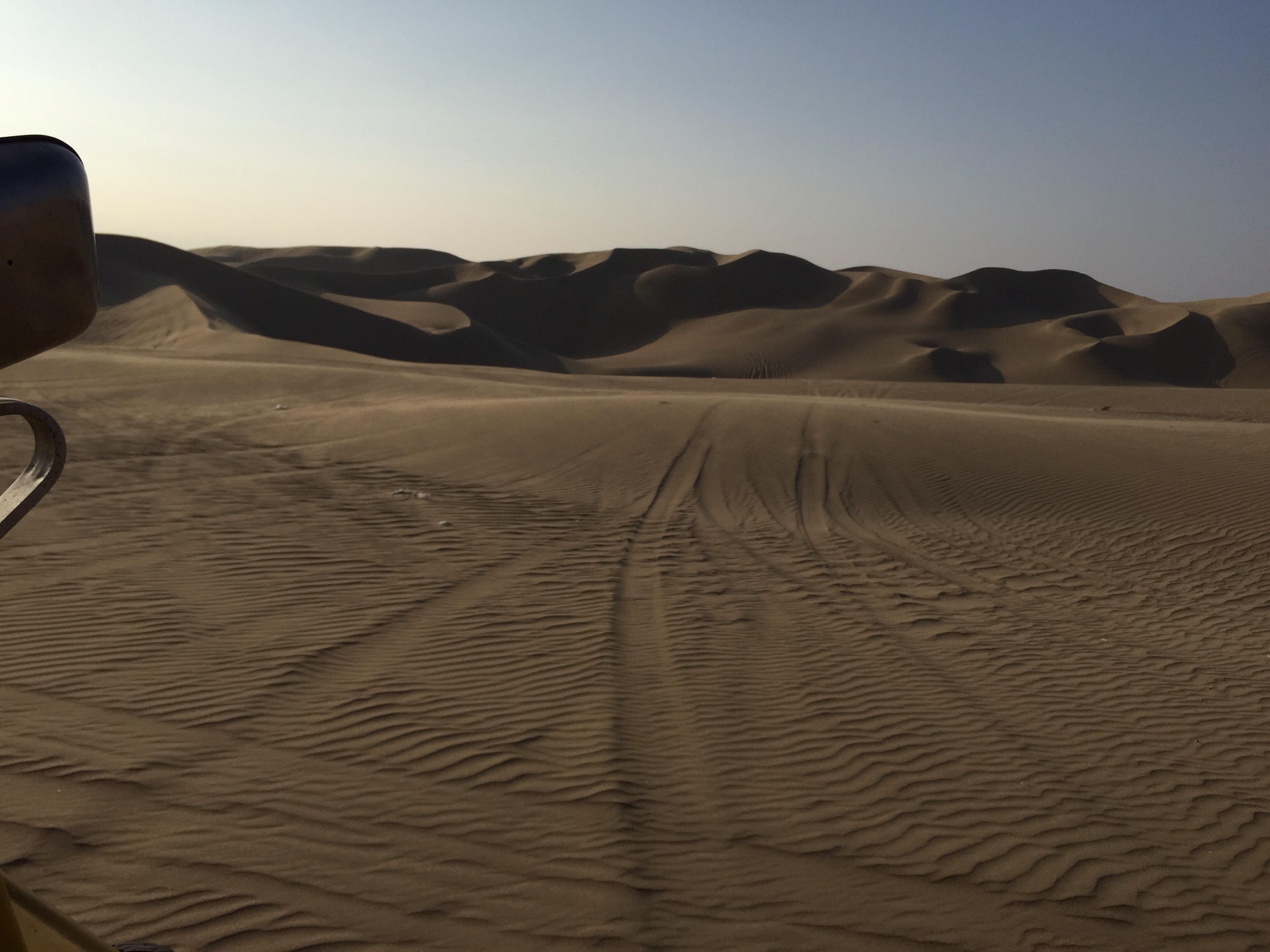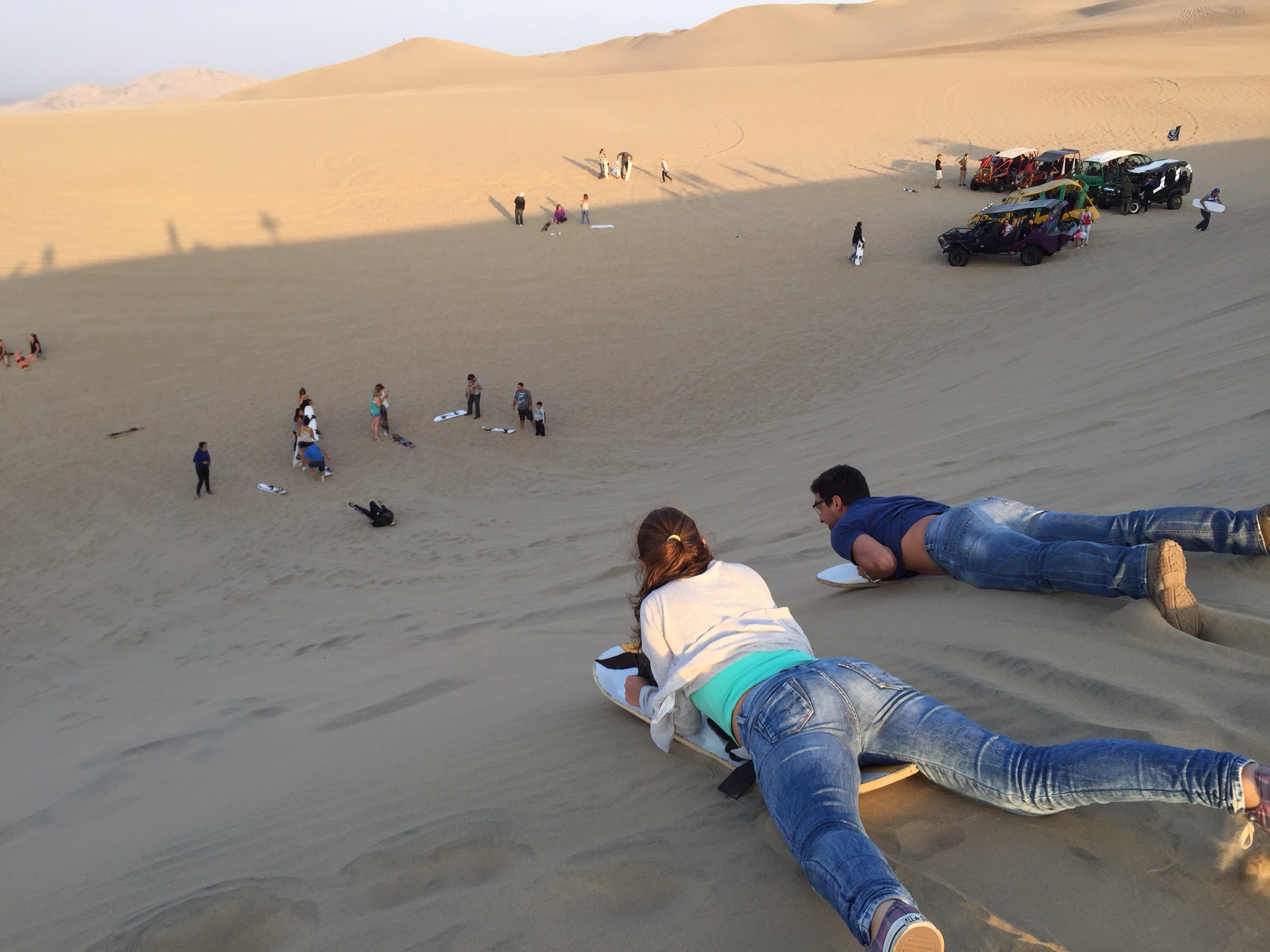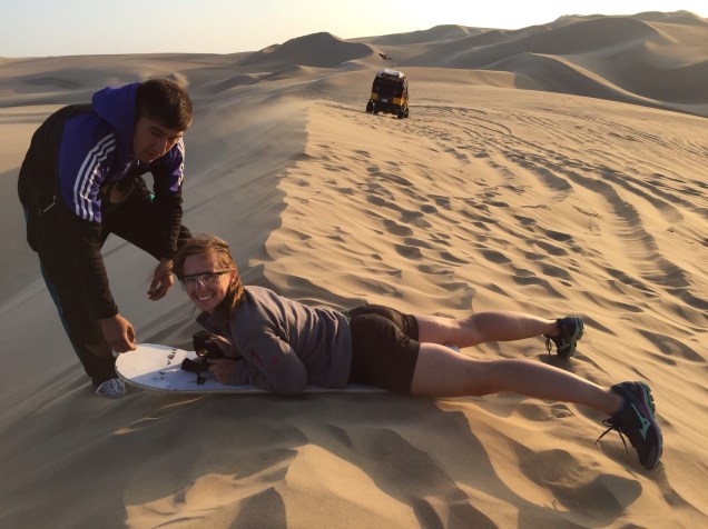 The dune buggy operator, no doubt, loves pushing the limits on how high or how fast we go. I am sure that there are moments when we are completely airborne. The initial ride lasts no more than 10 minutes before we come to an abrupt halt at the top of a dune. Sand boards are distributed, goggles adjusted, mouths tightly closed, and one by one we are sent careening face first down the mountain of sand. The driver whips around to pick us up and we repeat this sequence again and again. Each drop is between 50-100 meters, each one testing our nerves.