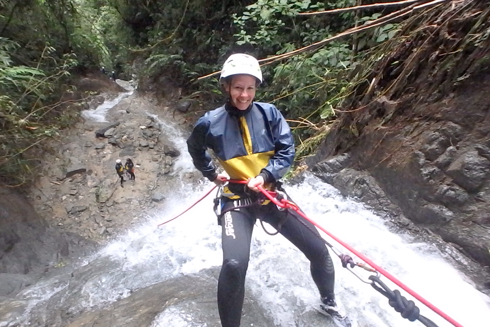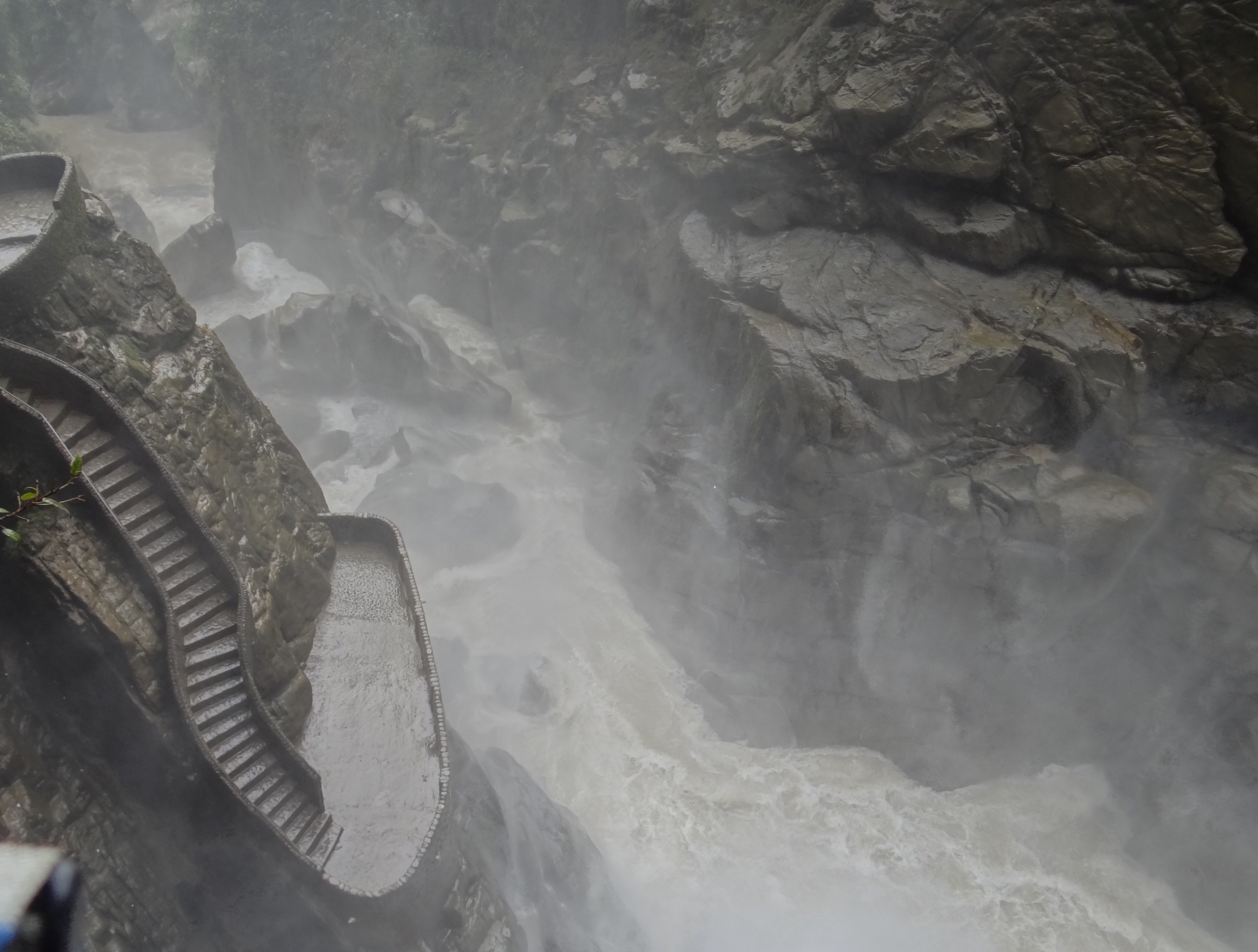 I immediately knew I wanted to try canyoning, which involves rappelling down a waterfall, but first to sample some of the “almost” free activities like any good backpacker should. Packing it in, I took a hike to the thundering Pailon del Diablo, or Devil’s Cauldron, where you can get up close (and drenched) to this magnificent beauty. Near the mid-point of the falls, you climb through a series of caves and tunnels to emerge in an absolute shower of ice cold water and can feel the true fury of this monster from behind.