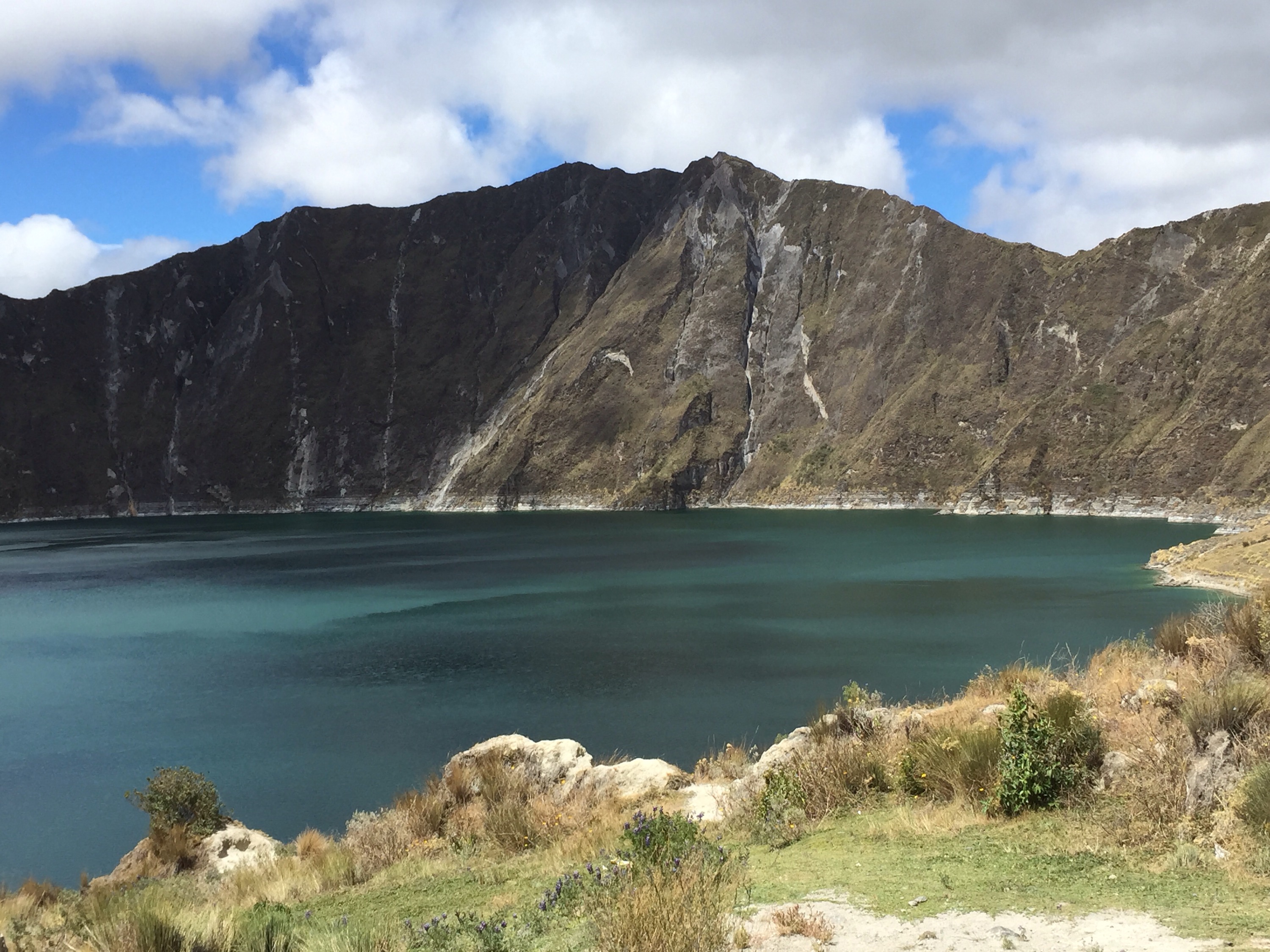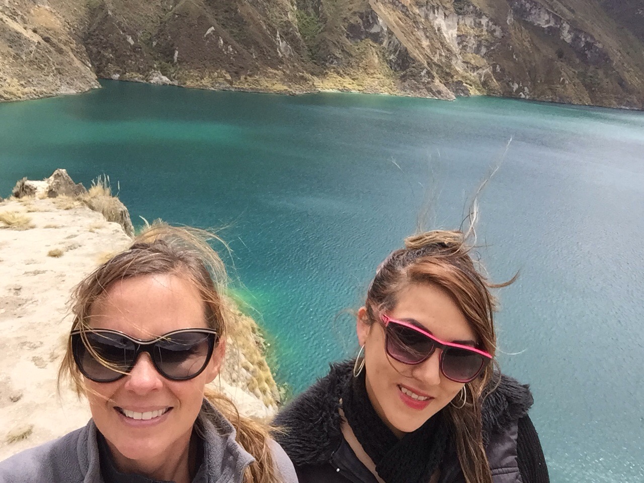 Not to be minimized in this post, Laguna Quilotoa is a jaw-dropping beauty. A former volcano that now encompasses a turquoise lagoon, it appears to be painted for the sole purpose of photography. It takes about one hour to slide down the path to the crater floor. The return trip takes about 3 times as long. It’s also possible to walk around the entire rim of the crater or to do a 3-4 day trek from town to town with the lagoon as the grand finale. Because I had a chaperone, Mari and I did the short version to the crater floor and back. As you might imagine, it was incredibly steep and challenging to traverse a volcano in an afternoon. The air was brisk and blustery, to say the least, and I was grateful for the company and the literal hand-holding Mari provided along the way.