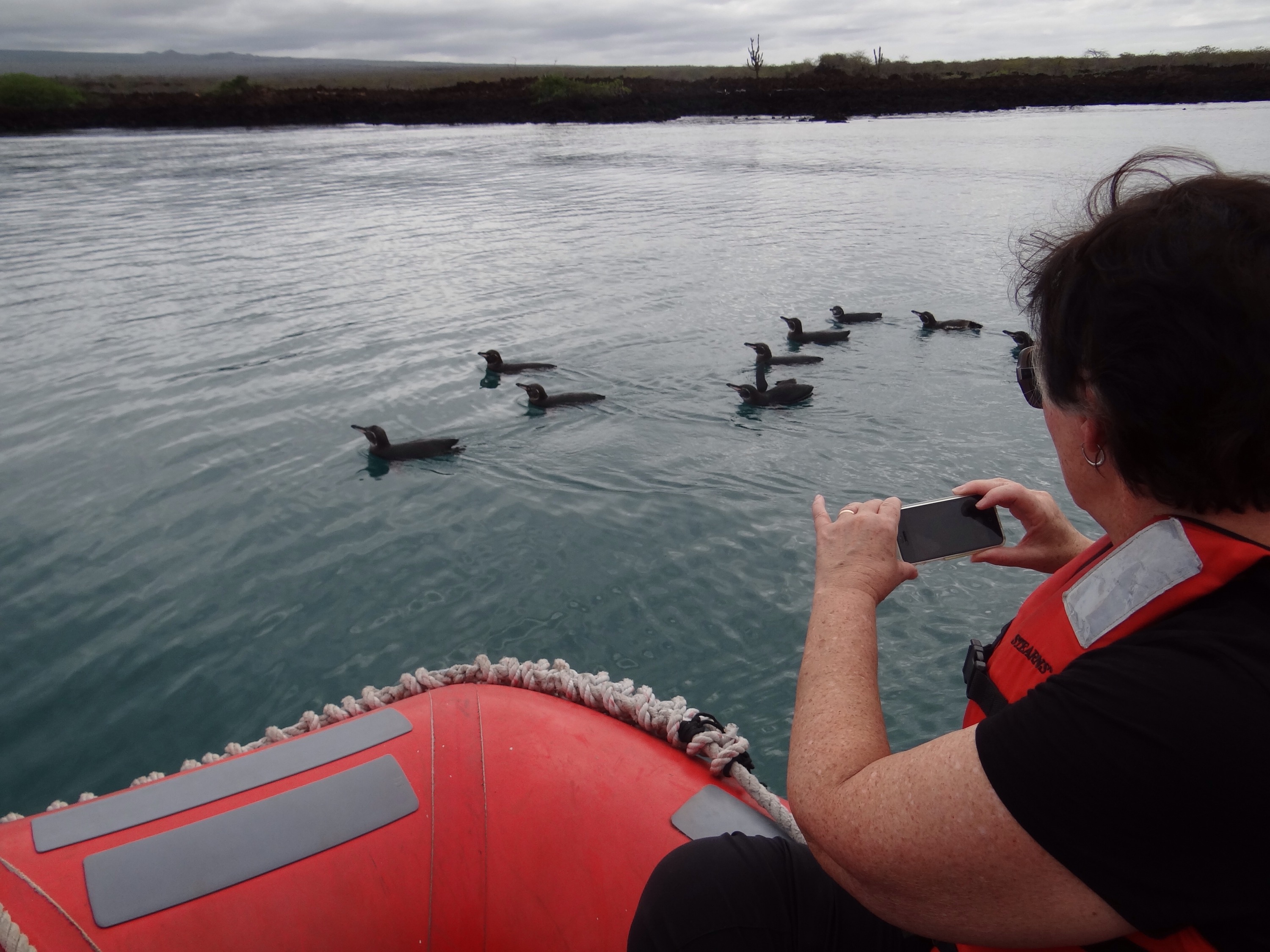 “Shark! There’s a SHARK over here!” I lift my masked face out of the water to hear another snorkeler calling the dreaded phrase and try to orient where the shout is coming from. But only in the Galapagos Islands does this warning warrant a horde of swimmers going TOWARD the shouting. Everyone wants to see a shark. It’s the prize like no other. The main sharks to be seen by snorkelers in the Galapagos are the white-tip reef shark and the black-tip reef shark. Our guide, Freddy, says the white-tip are harmless. The black-tip, he claims, are “nasty.” To an untrained eye, they look the same. I actually saw neither. By the time I knew which direction to swim, the shark was long gone, but how could I be disappointed amidst sea lions, penguins, sea turtles, iguanas, blue-footed boobies, and manta rays??