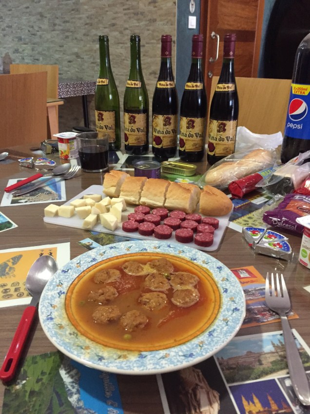 With the outskirts of Finesterre upon me, I was walking through a wooded beach when I see a figure moving toward me in a familiar blue t-shirt.  I knew immediately who it was – Hans had started walking along the path to pick me up.  It was a remarkable surprise.  Hans offered to carry my pack for me, but I refused.  It was my burden to carry until the end.  He had reserved a bunk for me in a decent albergue and had prepared a feast of meatball soup, cheese, chorizo, bread and 5 bottles of wine.  YES, I said FIVE!  I showered, dropped off my things, and together, we walked the last 3 km to Cabo Fisterra, the lighthouse located on the peninsula at the westernmost point of Spain, to watch the sunset.