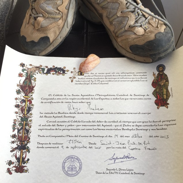 After a couple of wrong turns, we finally arrived in the large plaza looking up at the pinnacle landmark of the last 5 weeks, la Catedral de Santiago de Compostela.  There was scaffolding blocking the facade and the energy I had hoped for wasn’t there.  It felt completely anticlimactic.  We snapped a few photos and decided to go to the pilgrim’s office to obtain our Compostelas.  The line was short, but this was the first time I had a brief surge of elation.  The man behind the counter asked when I had started, where I had started, and scribbled my name and 775km in the blank designating the distance.  I stared at that piece of paper and I was immensely proud, as if I needed this certificate to somehow remind me.