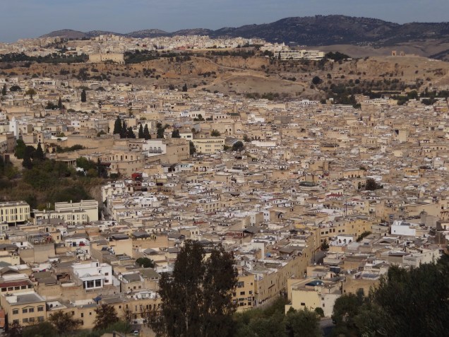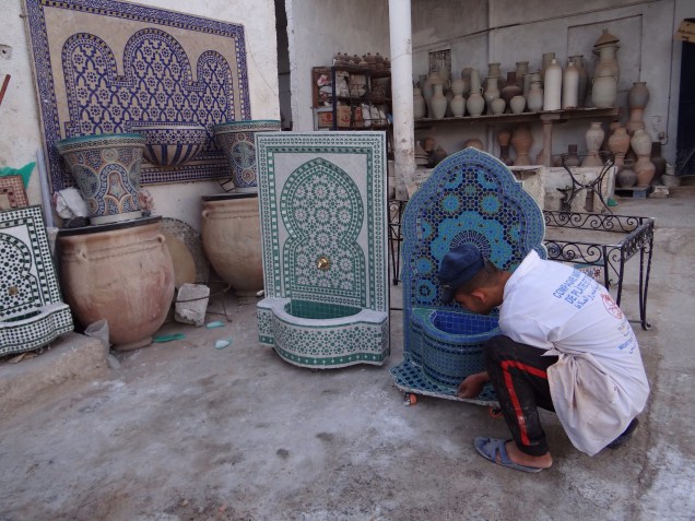 No time for rest before we are on a train to Fes for the next 2 nights.  Fes’s old medina is a tangled web of nearly 10,000 streets and alleys.  Getting lost in here would be an alarming prospect.  Fortunately, we were with a guide for the entire day.  The good news is that our guide served as a protector and most of the locals left us alone.  The bad news is that we spent the majority of the day visiting factories where we were expected to buy something – a tannery (leather factory), mosaic factory, dress factory, and bronze factory.  On my meager budget, I had no plans for shopping but a tactic I have adopted that seems to satisfy my souvenir appetite is that I take photos of the items I like instead of buying.