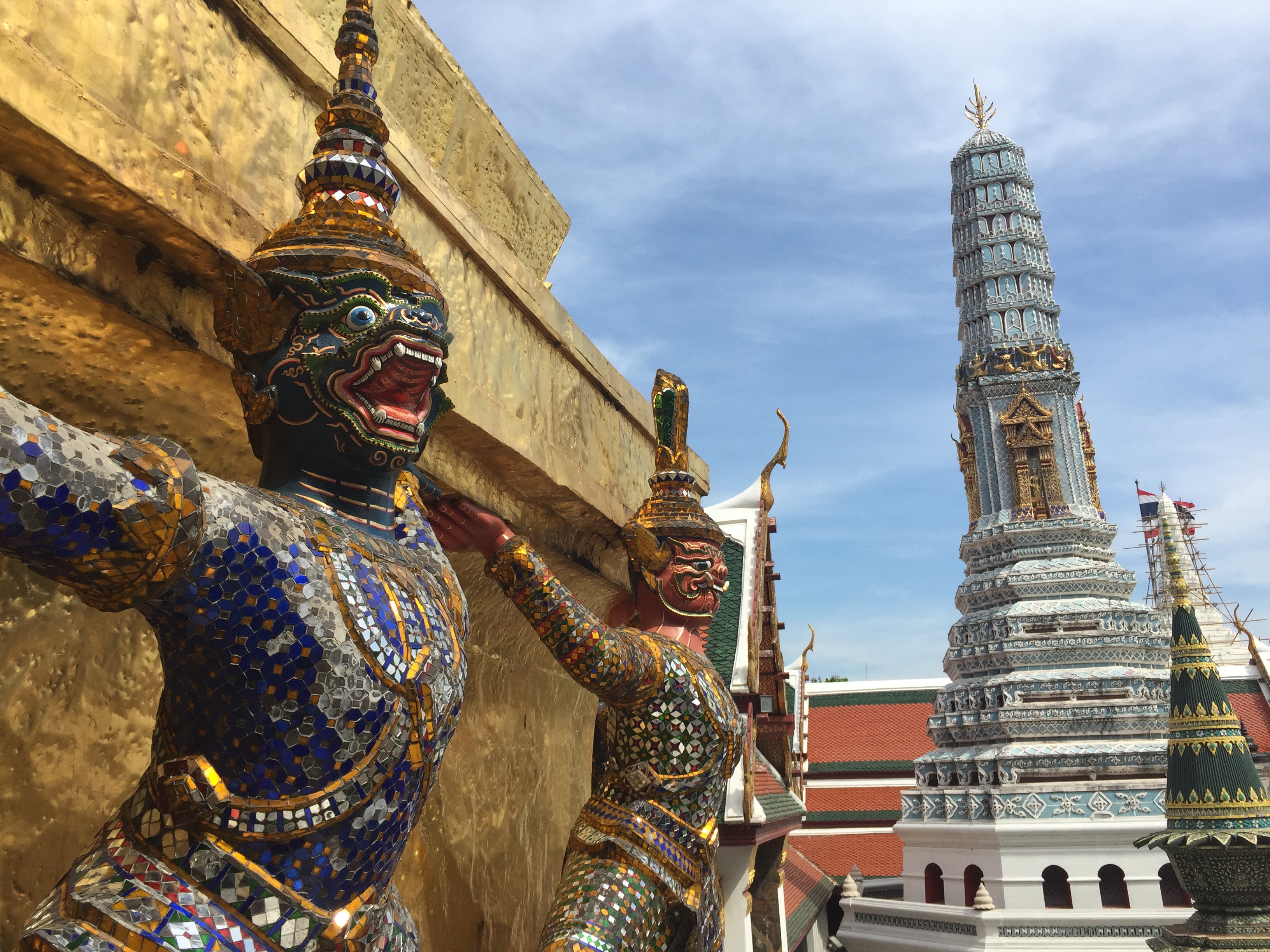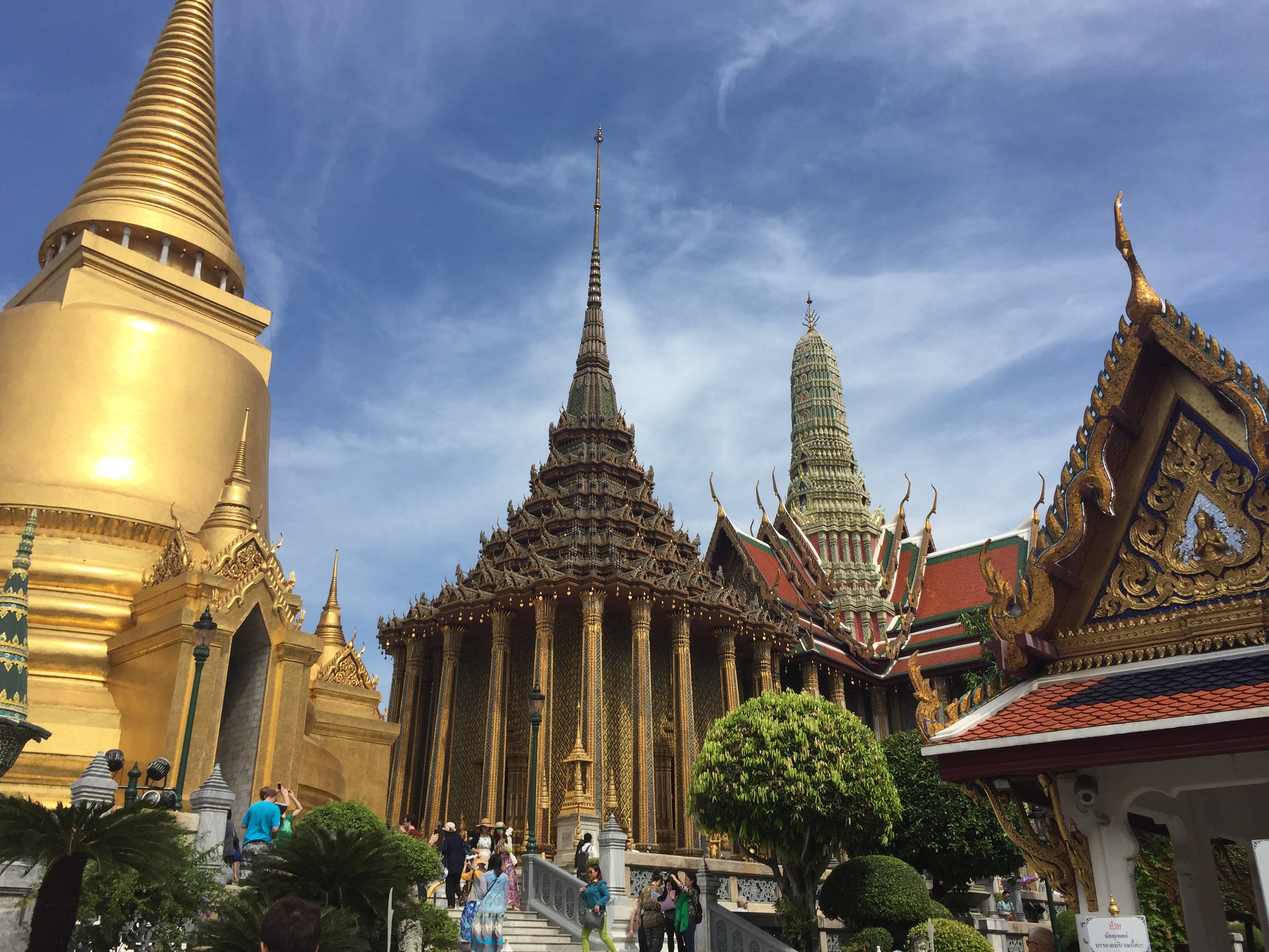 The Grand Palace in Bangkok is the star attraction. It was magnificent on the grandest scale. I hadn’t planned on visiting the Palace when I did so I was not dressed appropriately to enter the temples. Luckily, they are happy to lend the scantily-dressed foreigners the appropriate attire. Wearing a pale yellow button down shirt and a mismatched floor-length wrap skirt, I was beginning to feel more authentic already. The crowds were a bit overwhelming at times. I realized this was the first time since I left home that I had been somewhere during the peak season. There were Western tourists (usually the underdressed ones), the Americans always wearing sneakers, the Chinese traveling in large tour groups and shouting at each other to take one more selfie. Oh, the selfie sticks!! I’m not knocking it entirely – I have one – and I think it has its place at times, like when you don’t want to hand your camera to a stranger to take a photo or perhaps there is no one around to take a photo of you. But I venture to say that it is WIDELY overused in Asia. And I’ll stop there before I start stereotyping. If you’ve ever been to this part of the world, you know what I mean.