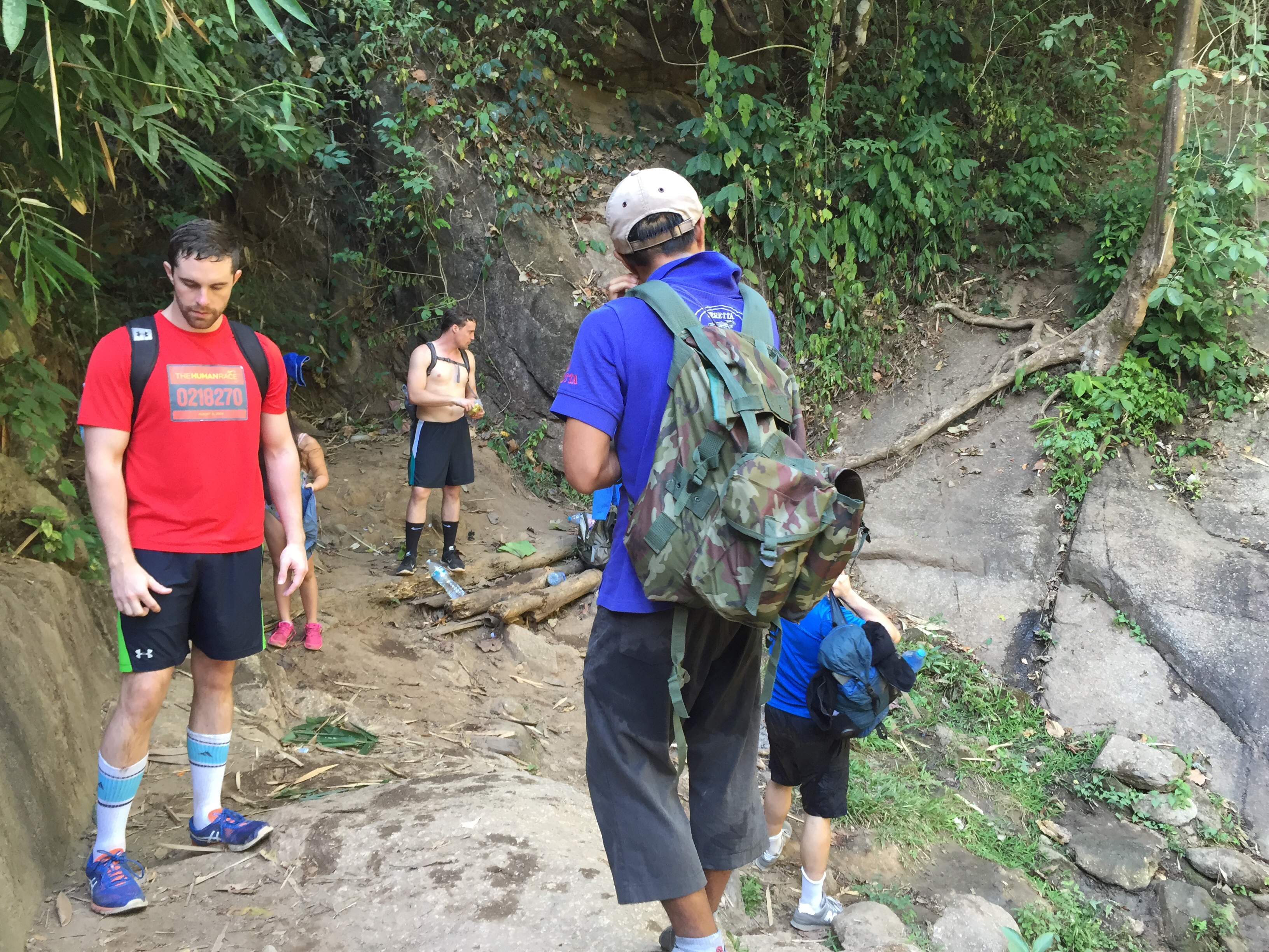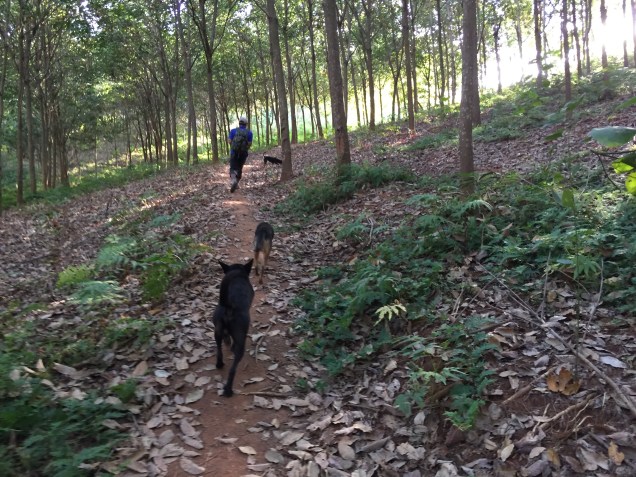 I was picked up in a songtaew, a pickup truck with seats in the back. There were already 4 attractive guys in the back. Not such a bad way to start! Four MBA students from Wharton, Andrew, Bill, Colin, and David were on a 3-week whirlwind tour of Asia. They turned out to be great fun, if not because they reminded me of people I may have been friends with in my other life back home. We picked up an Argentinean family with 2 young daughters and we were on our way into the jungle. The first day, I immediately noticed how hot it was. A sauna, if you must know. I’m not accustomed to trekking in warm weather. Thinking back, I’m not sure I ever have. Every trek I could recall had cool temperatures. We stopped early in the day for a dip in a waterfall. The waterfall itself was mundane as far as waterfalls go, but nevertheless, it was extremely refreshing. Two things happened at the waterfall. Andrew stepped on a piece of glass and did a number on his foot – so much blood! Trekking for two days on a foot that probably needed stitches was not going to end well. The other thing that happened was we acquired a pack of dogs, two of them fighting to be alpha, but all of them protecting us from I don’t even know what. It seemed normal that the dogs must follow every group of tourists, probably hoping for a handout. What wasn’t normal was that we also had a puppy. One of the Argentinean girls couldn’t part with it and against the explicit instructions of our guide, she carried the puppy far enough away from home that we had to keep it. She named her Casey.