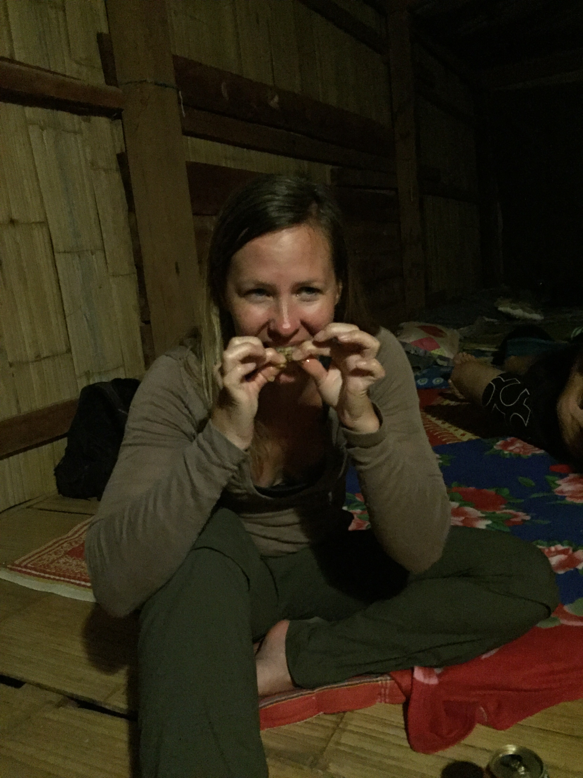 Our dinner was steamed rice and vegetables, prepared by the villagers, but the special appearance was reserved for the snake. The chef sliced it up into thin pieces, stir-fried with lemongrass and scallion, and served it to the group in a large bowl. Surprisingly, it looked pretty tasty so I was game for a taste. The verdict? It wasn’t bad (I even went back for seconds), but there were so many bones that it was entirely too much work to get to the meat.