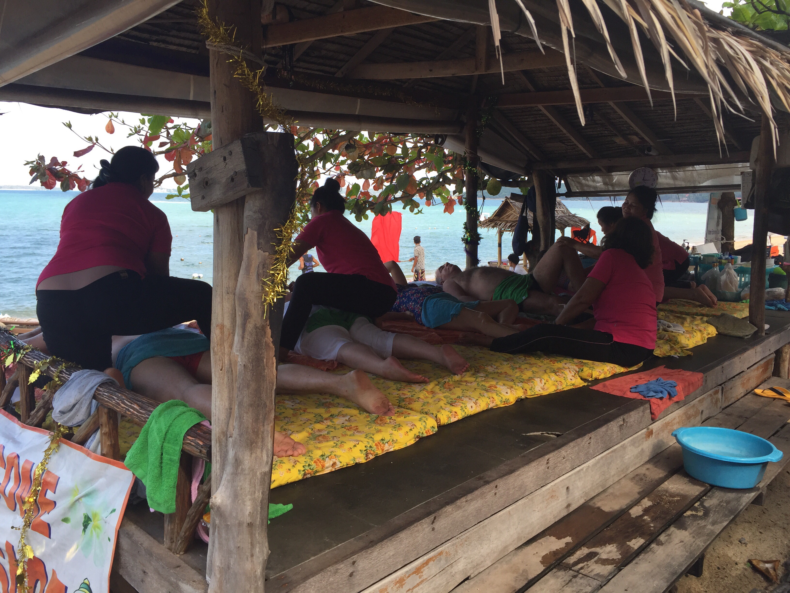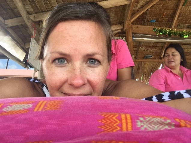 On our last day, we decided to visit a different beach. The area of Fishermans Village is a heavily touted tourist hotspot, complete with tacky souvenir shops, hair braiding, tattoo parlors, high priced fruity cocktails, and beach massages. I had been dreaming of a beach massage for the last several days. What may have seemed unattainable for this thrifty traveler, was surprisingly affordable. You can get a 60 minute massage in a cabana ON the beach for less than $10. Sold! And with no regrets on foregoing the Full Moon Party, Wendy, Ryan, and I spent our final afternoon facedown in a cabana cushion (with full possession of our pants).