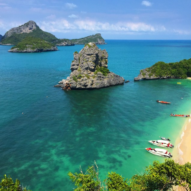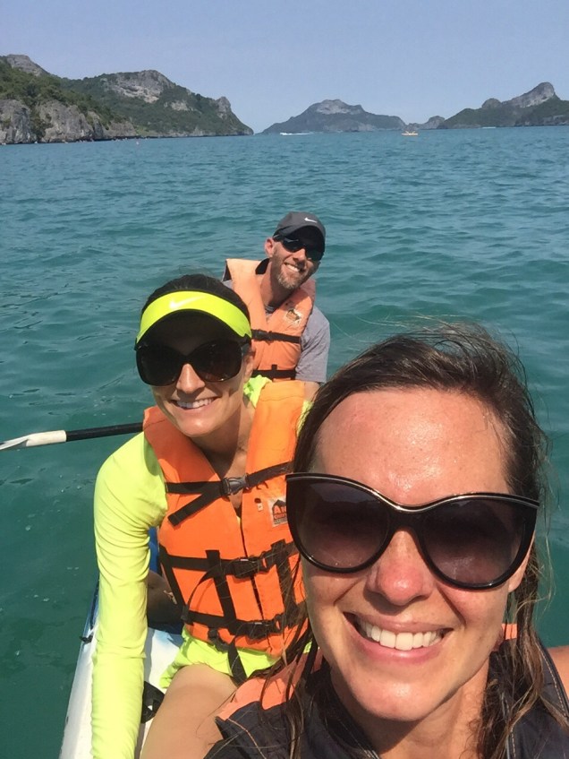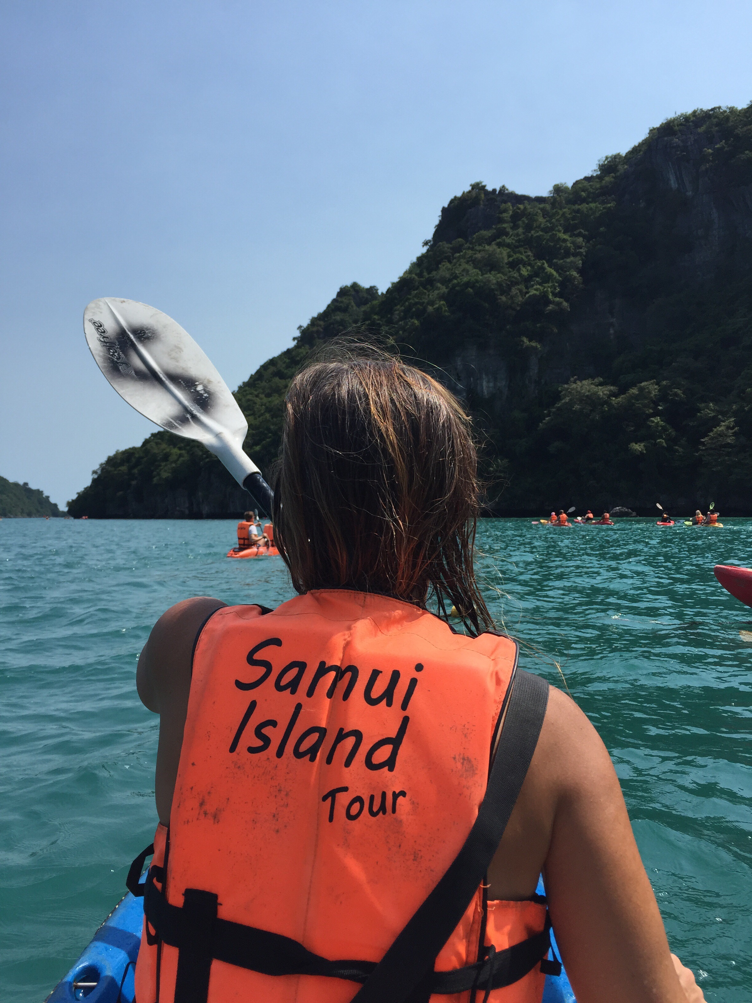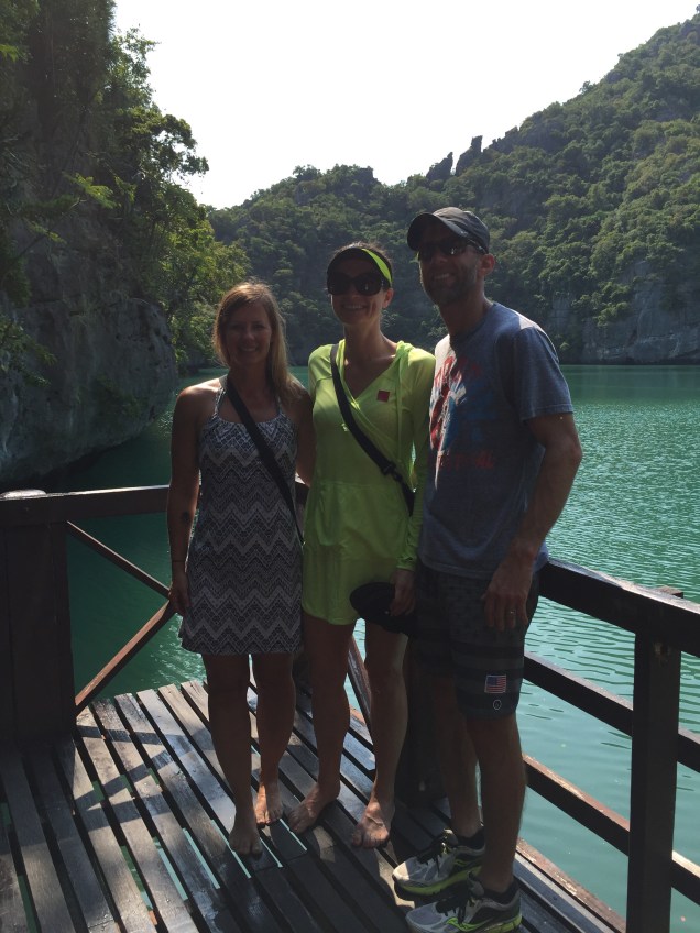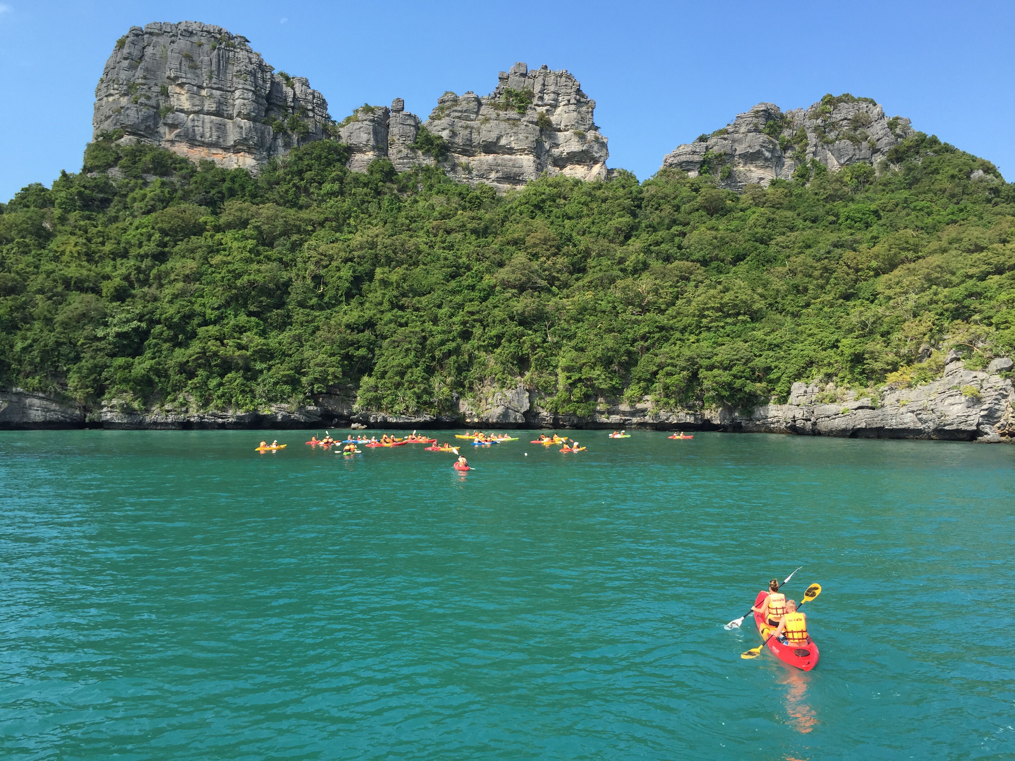 The following day took us to Anthong National Marine Park, an archipelago of 40 or so islands off the west coast of Koh Samui. It is characterized by towering limestone mountains, white-sand beaches, jungle, mangroves, and aquamarine water. Literally boatloads of tourists are deposited in the marine park every day for snorkeling, kayaking, and hiking. We were no different. On a boat outfitted for 75 of our fellow tourists, we were first ferried to a sparkling beach. It was beautiful if it wasn’t for the other 10 boats with an equal number of people on board. Sadly, it took away from the pristine setting.