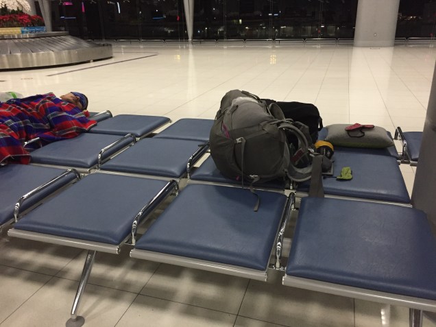 As a budget traveler, sometimes you have to make tough decisions about where to splurge and where to cut corners. A flight from Chiang Mai to Koh Samui on New Years Eve, no less, was outside of what I knew I should spend. But it was a no-brainer that I wanted to spend the holiday with friends and as a result, this is how I found myself sleeping in the Bangkok airport on the eve of the Eve. The things I have done to save money…. The fare was discounted if I flew from Chiang Mai to Bangkok on the 30th and Bangkok to Koh Samui on the 31st, a total travel time of 16 hours. Wendy and Ryan joined me on the 31st on a 90 minute direct flight. One day I will find this amusing I assume?