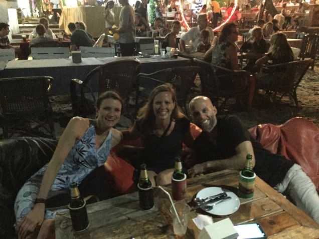 We shared a taxi to Chaweng Beach, which promised to be the liveliest part of our island. And it was. Throngs of people littered the streets, live music, street performers, dinner buffets, and drink “specials.” It was still fairly early in the evening so we easily secured a beach-side table, complete with bean bag chairs and a nice view. We selected this particular restaurant because we could still order a la carte off the menu and the drinks still held a reasonable price compared to nearby establishments. We ate a seafood dinner and ordered round after round of Tiger Beer until the beach had become quite crowded. A party vibe was in full force.