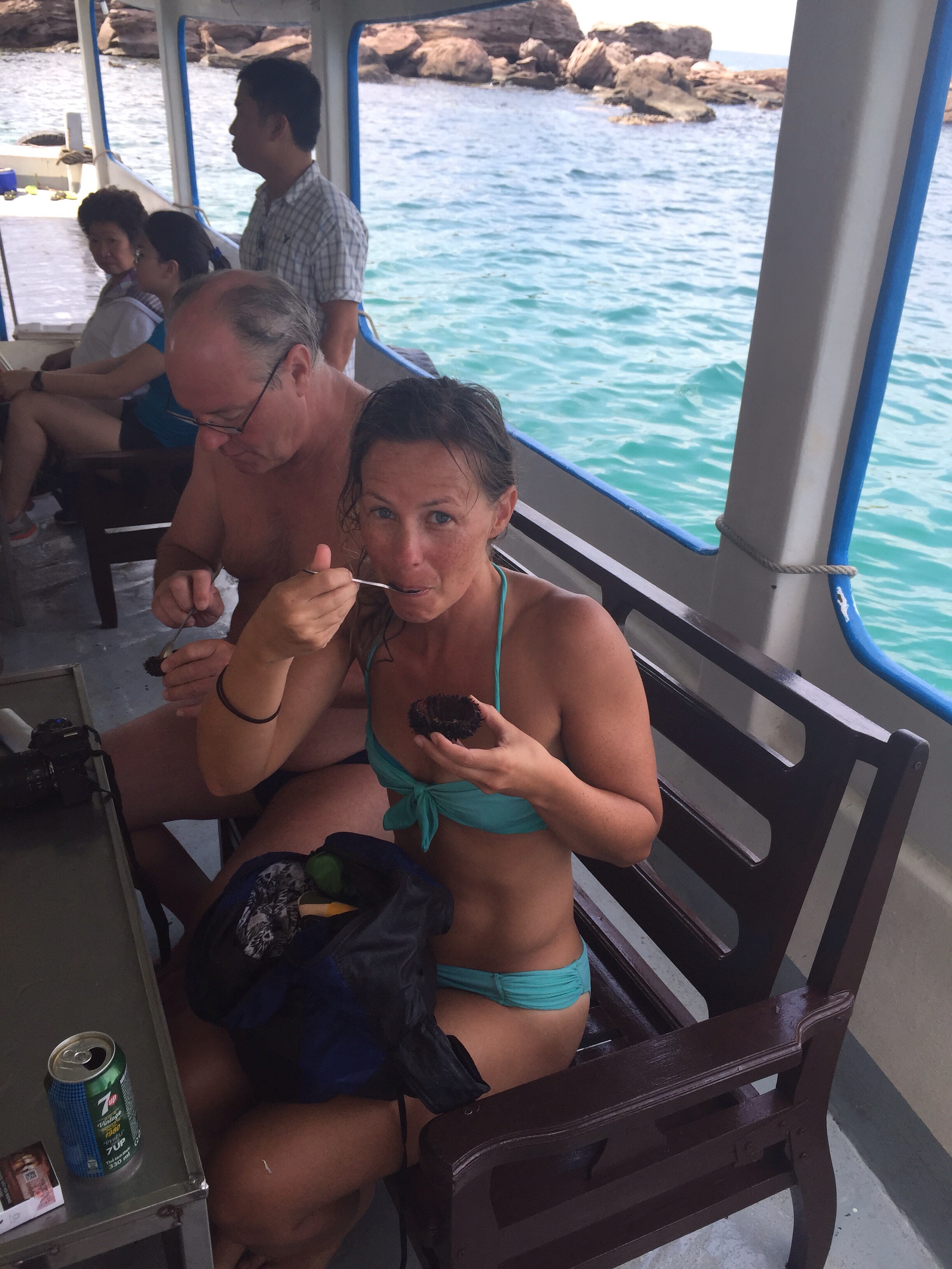The whole lot of us went snorkeling my first day on the island. I still laugh when the tour operator showed up to tell him our group had grown from 8 people to 18. As any industrious Southeast Asian tour operator would do, he crammed us all into the van, sitting, standing or crouching. Boat capacity? Never mind that, only a technicality. Where there is a will, there is a way, you know! We were detained for a 45 minute interval by the police, no doubt because we were using an unlicensed tour or because bodies were overflowing from the van, but our guide patiently negotiated with the authorities until we were finally permitted to leave. Ultimately, for $9, we got to try our hand at squid fishing (no one succeeded), snorkeling with loads of garbage and plastic bags (that uncannily look like jelly fish underwater), and had a smorgasbord of a lunch on deck (I even tried sea urchin!).