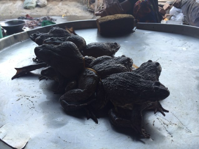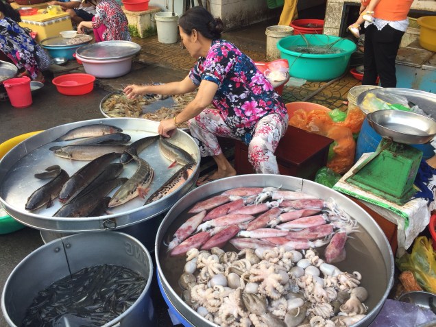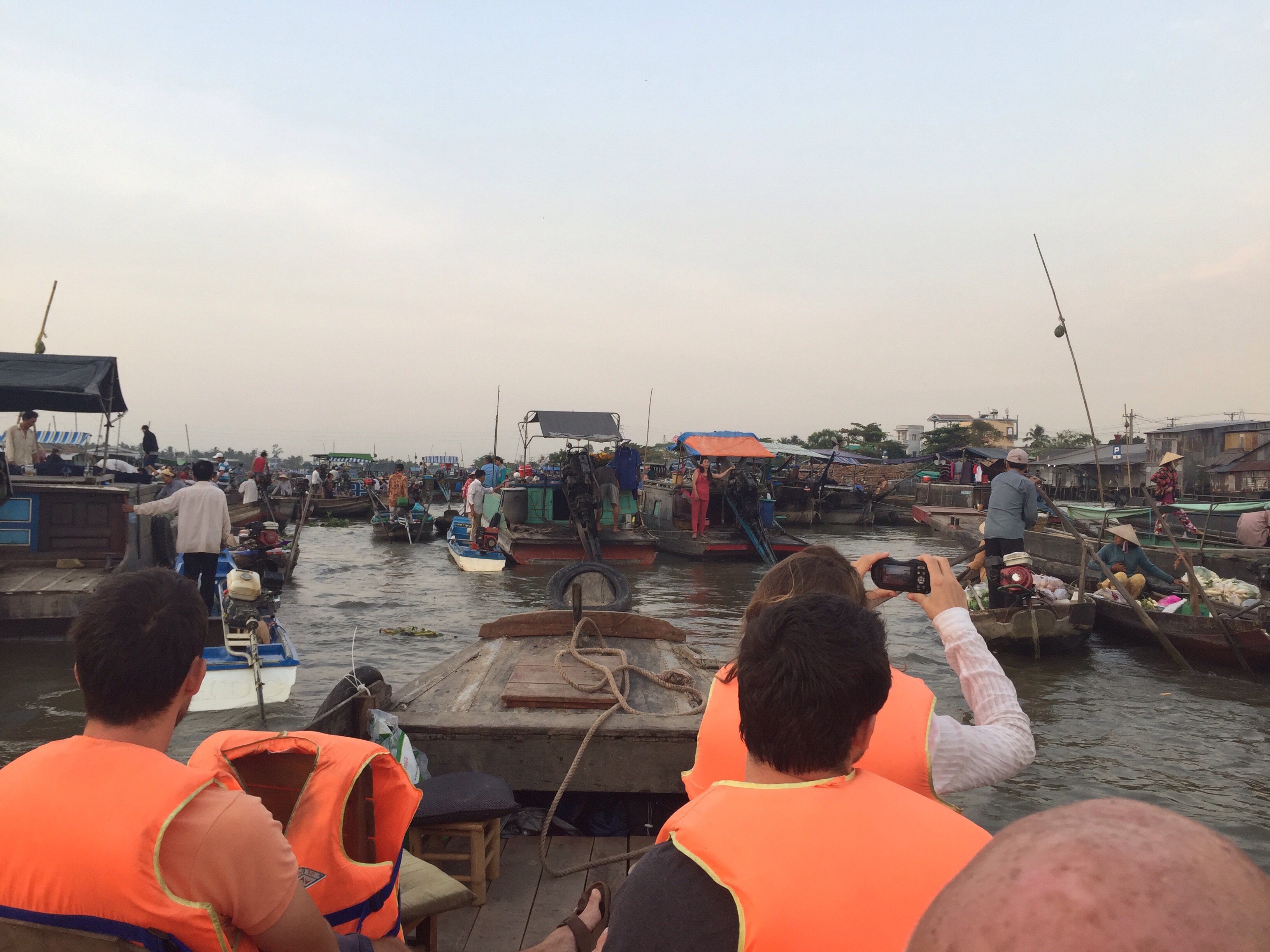 Next, we disembarked to the land market, which was equally vibrant and full of life. Motorbikes zoomed through the narrow alleys, some loaded with baskets of flowers, some with a string of fish, and some with an entire pig carcass strapped to the back. There were live frogs and dead rats, crickets and spiders and slugs. Pretty much anything that moves or grows is edible. Nothing is wasted. If it’s not edible, then perhaps it can be used in medicine or to make clothing or for decoration. The ground was covered in muck, probably a paste of animal blood and mud. It reeked of rotten meat and raw sewage. It was a smelly, dirty place, yet there was a real sense of community at the market and a very functional part of everyday life in the delta.