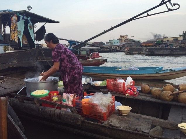 The floating market is a series of boats, all sizes, that tie up together and represent all commerce in the area. You can find anything from flowers to watermelon to soup. We set off before dawn. This was the Friday before Tet and, we were told, the busiest day of the year because the next day, the market would close for 4 in a row. My timing was impeccable….and pure coincidence. Gordon Ramsay had once visited the delta on his show. After having sampled soup from a local woman, he declared that it was the best soup he had ever tasted, skyrocketing the woman to local fame. She couldn’t churn the soup out fast enough for the demand. Sadly, her home had recently burned down and the community had rallied behind her with donations and support to keep her business afloat (pun intended).