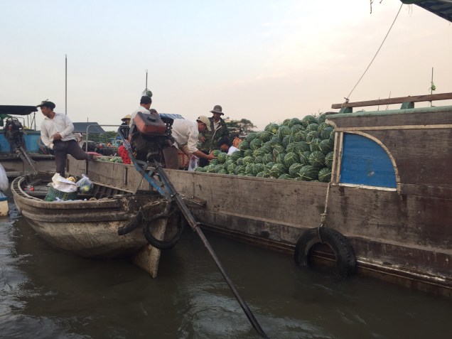 Loud speakers squawked in Vietnamese. Our guide, who was Canadian (go figure), explained that they were making announcements about international markets, mostly US and Chinese markets, the relationship of the dong to the dollar and the yuan. It was a bit chaotic but in an organized way and I found it fascinating, the way that each customer knew exactly where to find the vendor he needed amongst the sea of floating shops. Instead of signs, a boat might attach a bag of onions to their mast, if that’s what they were selling or a bag of beans. Smaller rowboats with sundry items, like chips and soda and beer, would randomly pop up next to us. These were usually manned by boys younger than 10 years old.