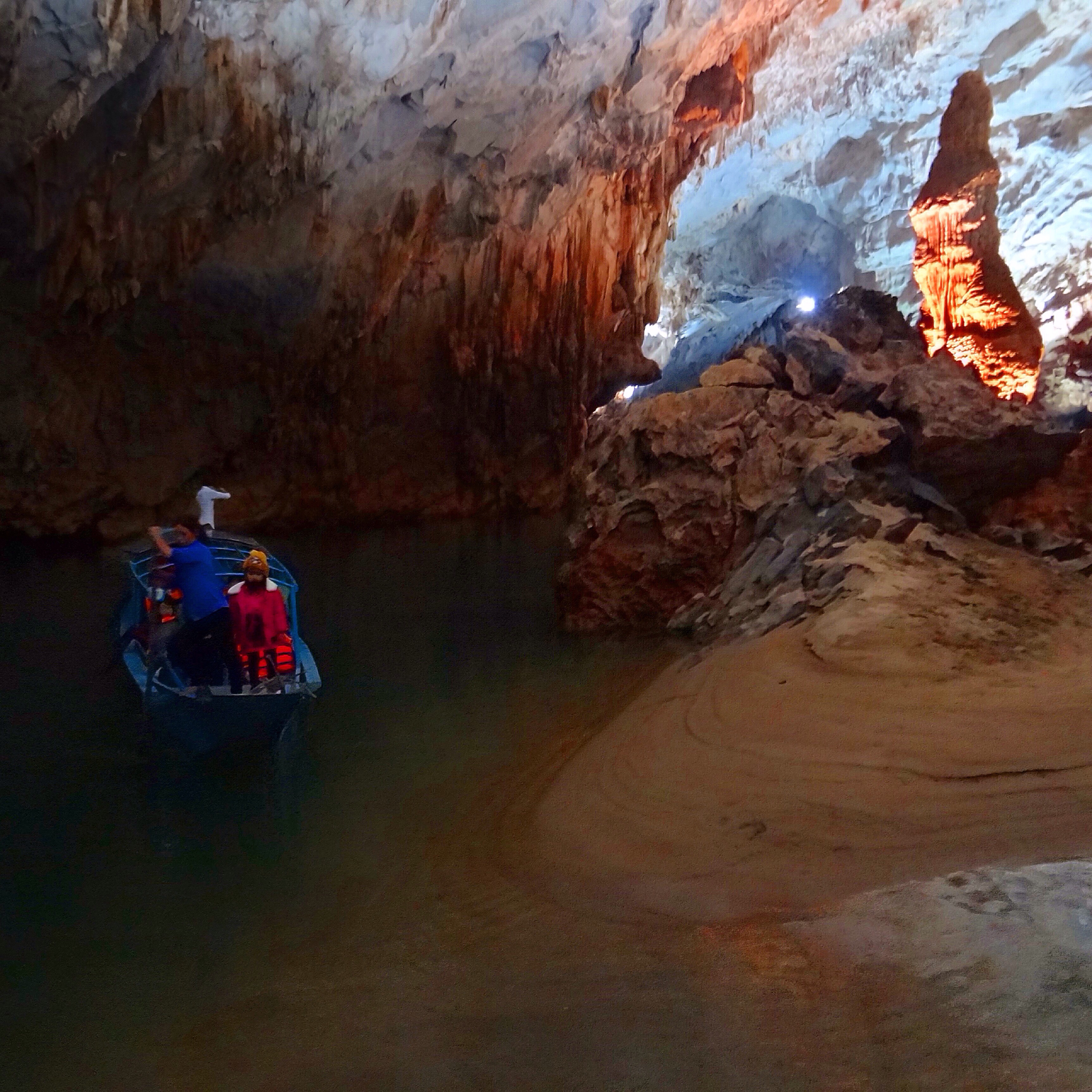 Back in the town, we returned our bikes and hired a boat to take us into the wet cave, Phong Nha Cave. This one had been a former hiding cavern for equipment during the war. This region of Vietnam had been bombed nearly every day for almost a decade, trying to destroy the supply line for the North Vietnamese. The limestone cliffs had been pocked with bomb craters and the lush jungle was burned and barren. Seeing the beauty before us now, it felt tragic that it had ever been any other way, but also promising to know that it had recovered. Our boatman cut the motor before we went inside so that he could paddle with a long oar. Occasionally you could hear drops falling from the stalactites above us, but otherwise, we were enveloped in silence. We were compelled to whisper to not disturb the natural order. On the return, the boatman let us get out and walk back to the entrance along a dry pathway. The path was a brief wander through stalagmites and a fine powdery red sand, not unlike what I imagined a moonscape might be like.