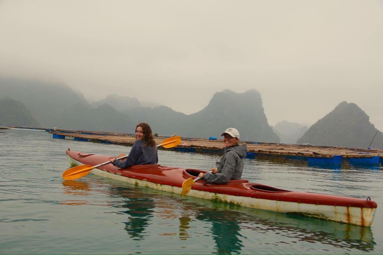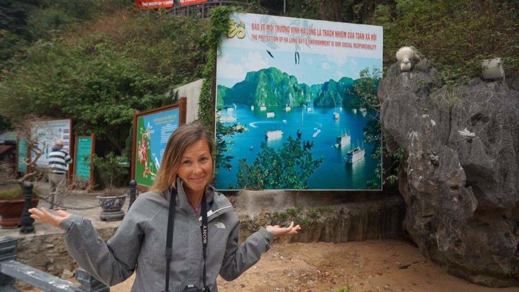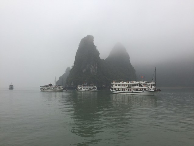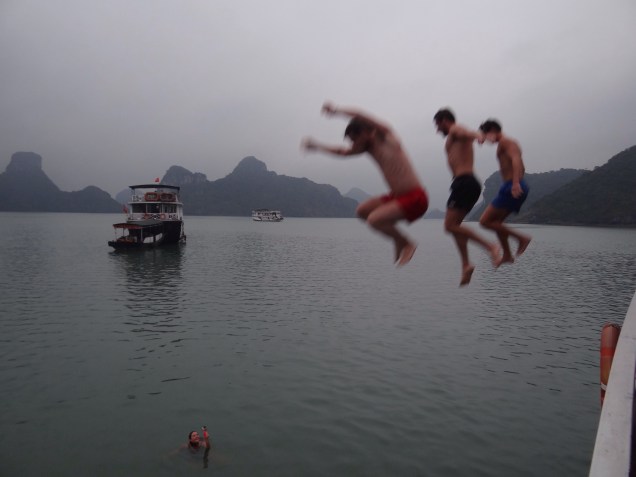 The bay was packed with other passenger cruise ships as I imagine it always is, but a thick cloud hung over the landscape, partially obscuring our view. The sky remained eerie and colorless; the water was a milky green color that was in no way inviting to dive in. We stopped at a cave called Paradise (see previous post, The Caves – the Vietnamese are not creative in their cave names) and a poster of the bay on a sunnier day was proudly displayed, taunting us. Back on the ship, Stephie and a few other braves souls made the obligatory plunge into the winter sea, but I just couldn’t do it. I much preferred the comfort of my fleece jacket on such a chilly afternoon.