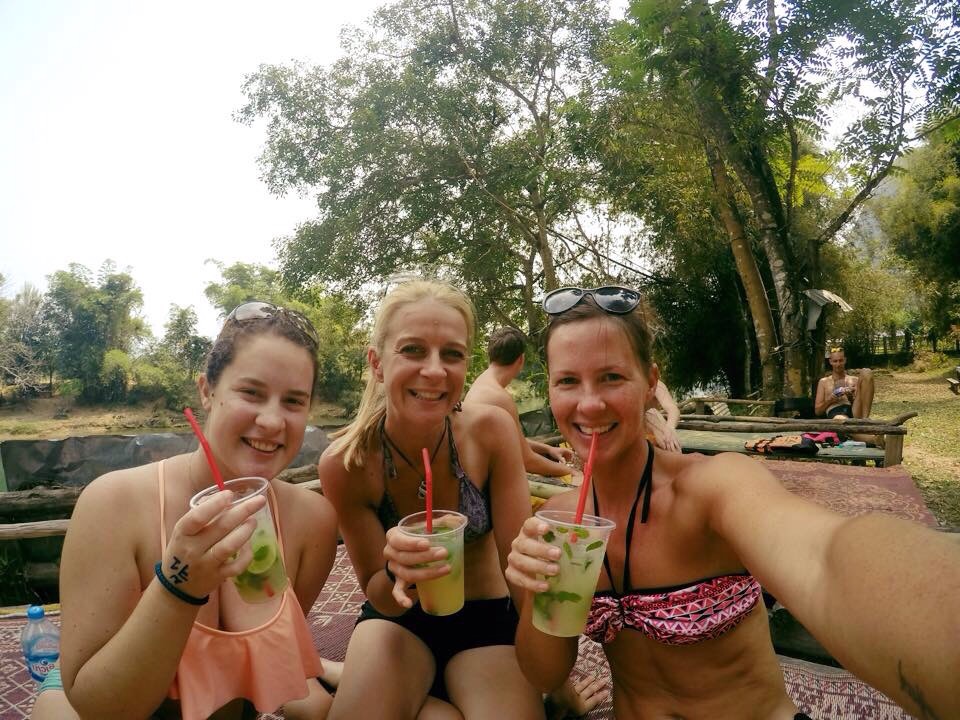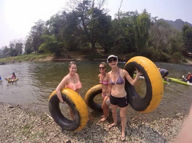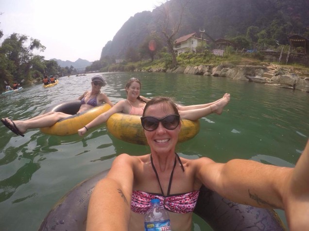 Darcey and I arrived on different buses. On hers, she met Melinda, a flight attendant from Melbourne who was just on a short holiday in Laos. And because tubing is lame when you’re solo, the three of us were keen to give it a go together. It was all seemingly well organized in contrast to most activities of this sort in Asia. There was a central tubing office (a couple of guys sitting in a bamboo hut with a stack of rubber tubes), where you had to go at whatever time you wished to rent a tube, sign a waiver, and jump in the next available truck to the starting point. The waiver part surprised me because even if there had been accidents in the past, this was an entirely new concept in the Asia I had experienced so far. It was a sign that the west had touched this corner of the planet when the accidental deaths and ensuing turmoil had brought government intervention to the former party scene.