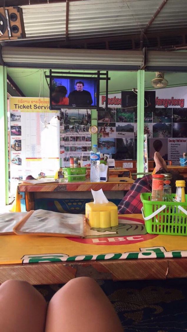 Worth mentioning, perhaps one of the most quirky things about Vang Vieng is the abnormally high concentration of cafes, also known as “TV bars,” that play episodes of Friends on a continuous loop. I can’t even say how many there are, but I counted at least 4. Seating is set in a theatre-type configuration with pillows and cushions and you could potentially watch a Friends marathon for 12 hours a day. For someone who isn’t exposed to that much television these days, I wasn’t opposed to a few hours of comfortable lounging myself. The day after our tubing adventure, Darcey fell ill with food poisoning or something like it and I was suffering from a sore throat and headache that lasted off and on for the following week. As soon as she was up to it, Darcey left for Luang Prabang, needing a change of scenery. I stayed in Vang Vieng for another day with Melinda, hopeful I could knock off my sick feeling before I had to travel.