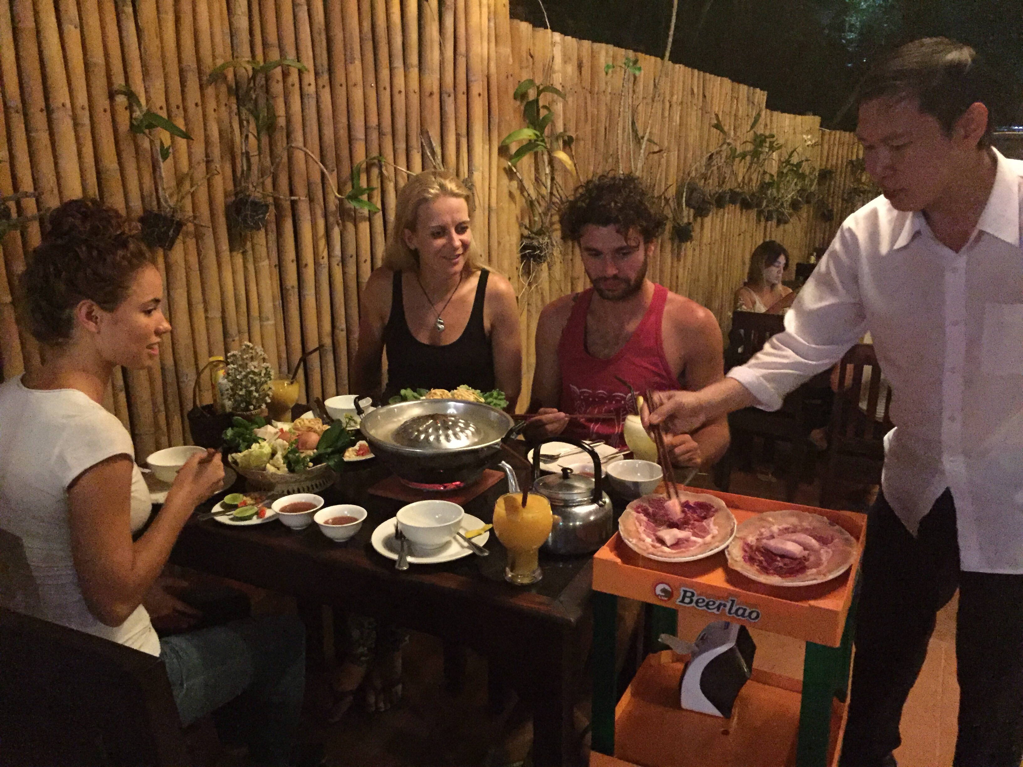 My first night back in the city, I reconnected with Melinda. Her short holiday was coming to a close and she would be leaving the following day to go back home. Together with Iris, a lovely Norwegian girl I met in my hostel, and a French guy that Melinda knew, the four of us decided to try a Lao barbecue restaurant. A metal pot, shaped like a bundt pan, was placed in the middle of the table and a large plate of raw meat, eggs and vegetables was artfully displayed along with it. First, using a chunk of pork fat to grease the hump in the middle and pouring a generous amount of water in the basin, we were able to grill the meat and boil the vegetables at the same time. It was a fun interactive way to enjoy a social meal. The eggs, being the trickiest item to master, were mostly poached or scrambled by the time they slid from the hump (for frying) into the water and then fished back out using a fork and chopsticks.