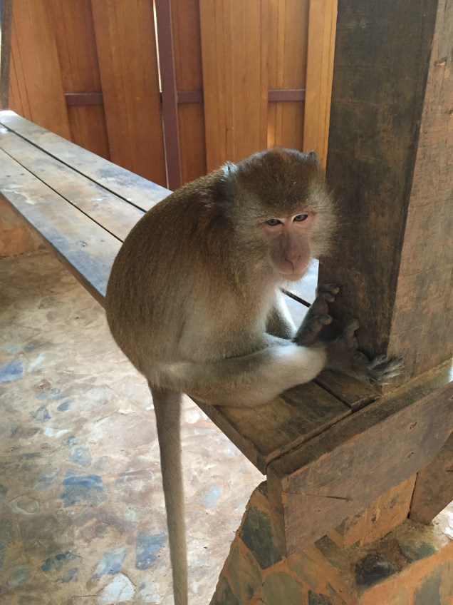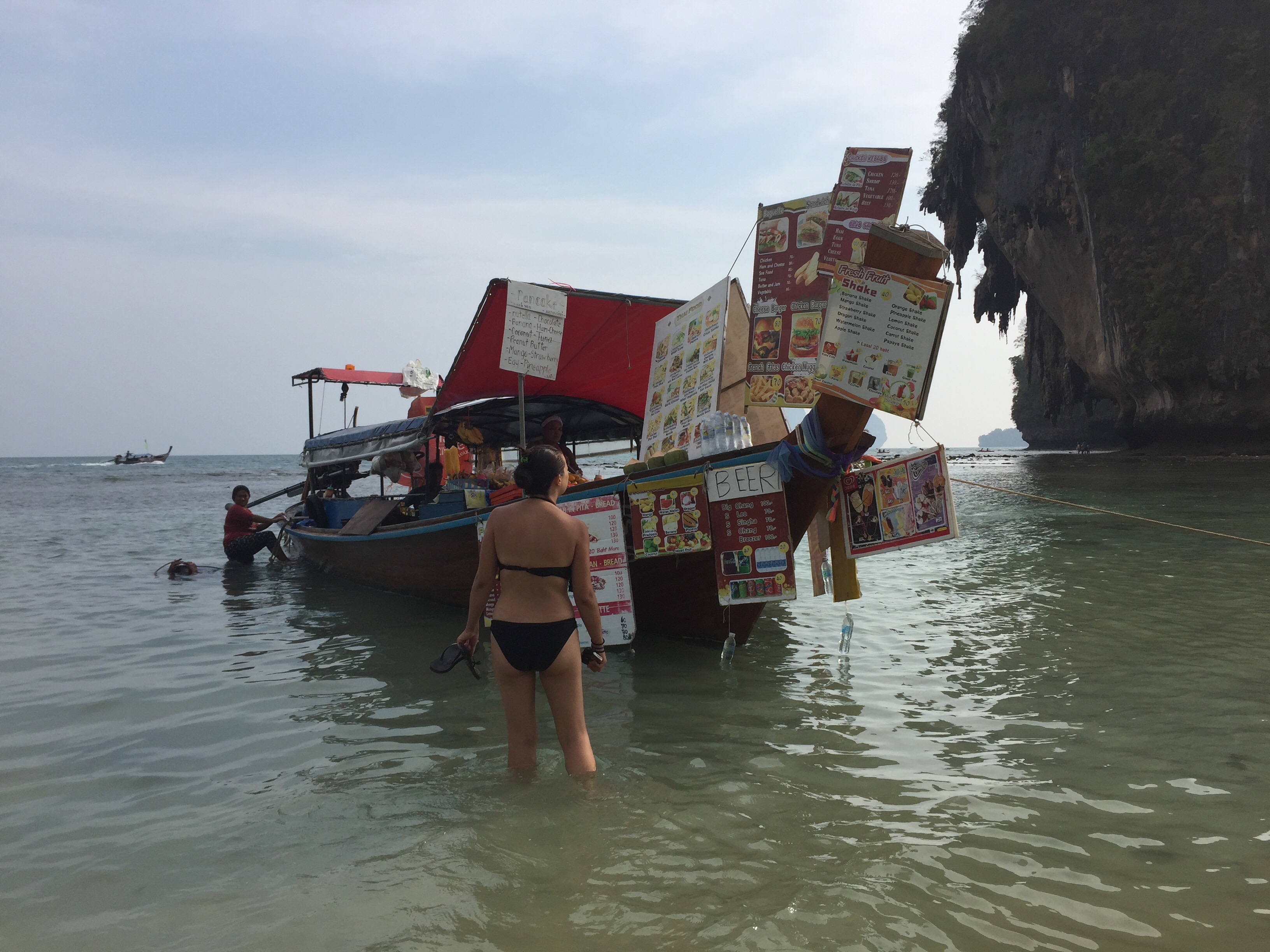 Monkeys were the lords of this strip of sand as they had learned how to target the humans with food. Ofelia was carrying a mostly eaten cob of corn while she looked for a rubbish bin when one monkey charged her and easily snatched it from her grasp. Others were playing with sunglasses or hotel keys that they had stolen from unsuspecting tourists. Restaurant employees fought back with sling shots aimed at these rascals. I don’t care to know what weapon armed the sling shots though. In spite of the furry nuisance, the rock-climbing cliffs that punctuated the shore were a perfect backdrop. Long tail boats had signs boasting smoothies and snacks so if you waded out in knee-deep water, you were lucky enough to get a meal from one of these temporary kitchens. A really nice day was enjoyed by us all.