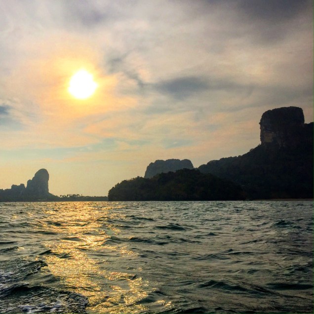 When it was time to return to Krabi town, we met our captain back at the same place where we had arrived, but the tide had gone out so it was no longer possible to reach our boat from the rubber dock. We had to slog almost 100m through mucky sloppy sand, tiptoeing around little translucent crabs, slipping and sliding when we would accidentally step on a moss-covered rock. On the open water, the sea had turned angry and huge swells slammed into the side of our little skiff. I remember feeling a great surge of relief when we finally slipped into the bay and the waves grew calm again.