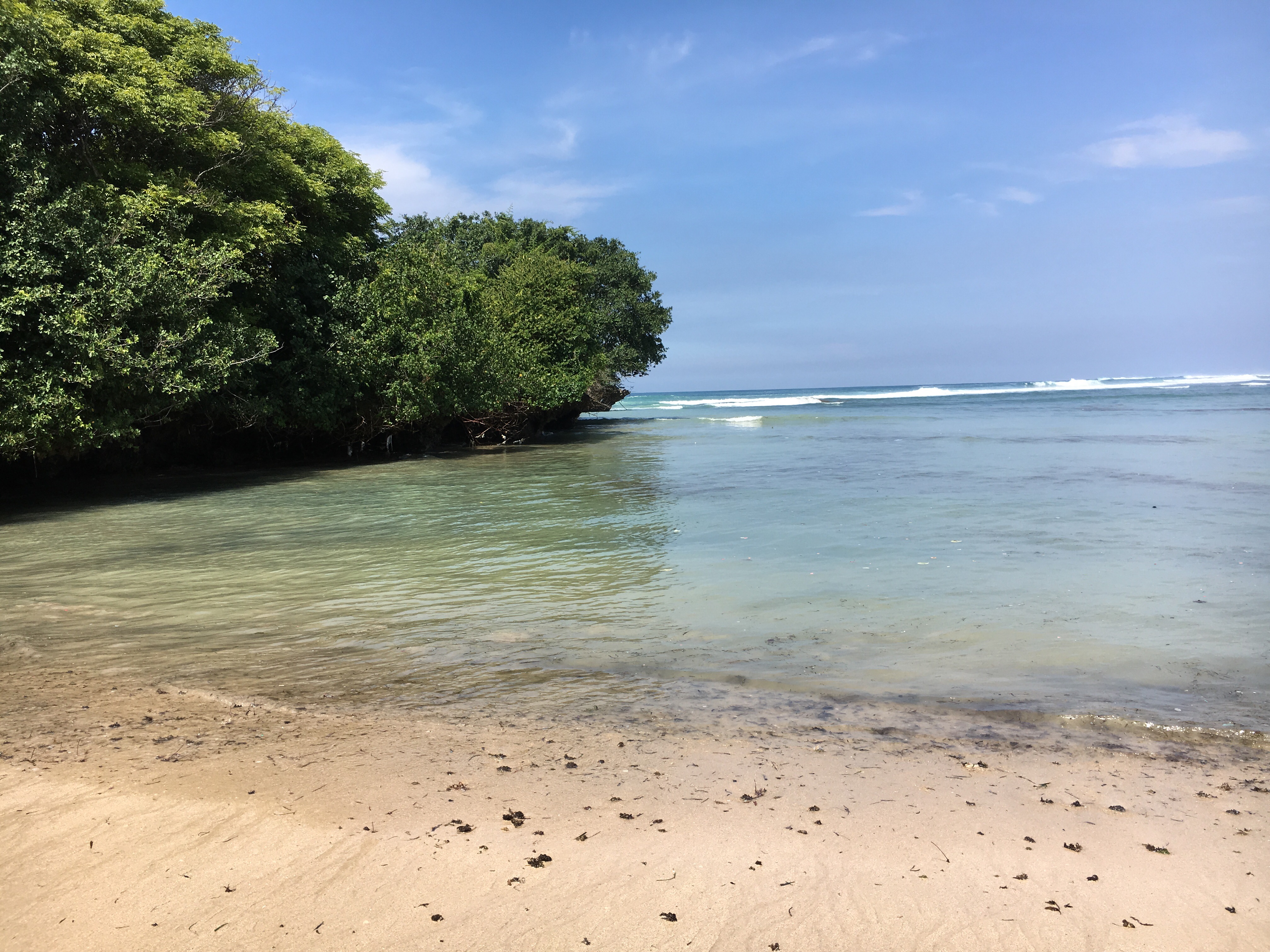 I found an off-the-radar hotel that claimed to be in Nusa Dua. Not in line with my traveler class, Nusa Dua is consistently considered the high end part of the island, but that’s where my kid-friendly beaches were said to be, with foreign kids (who generally do not throw rocks at dogs!). I wanted to be there. The only hotel with good reviews within my price range was Mahogany Hotel. It was at least 15 minutes drive from any beach, although they offered a free shuttle. There were no tourist services on the main road near the hotel, including any restaurants. Mahogany solved that problem too by having a decent restaurant of their own.