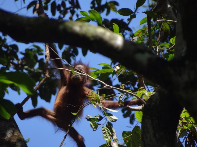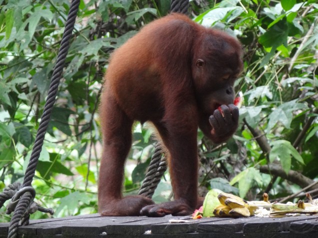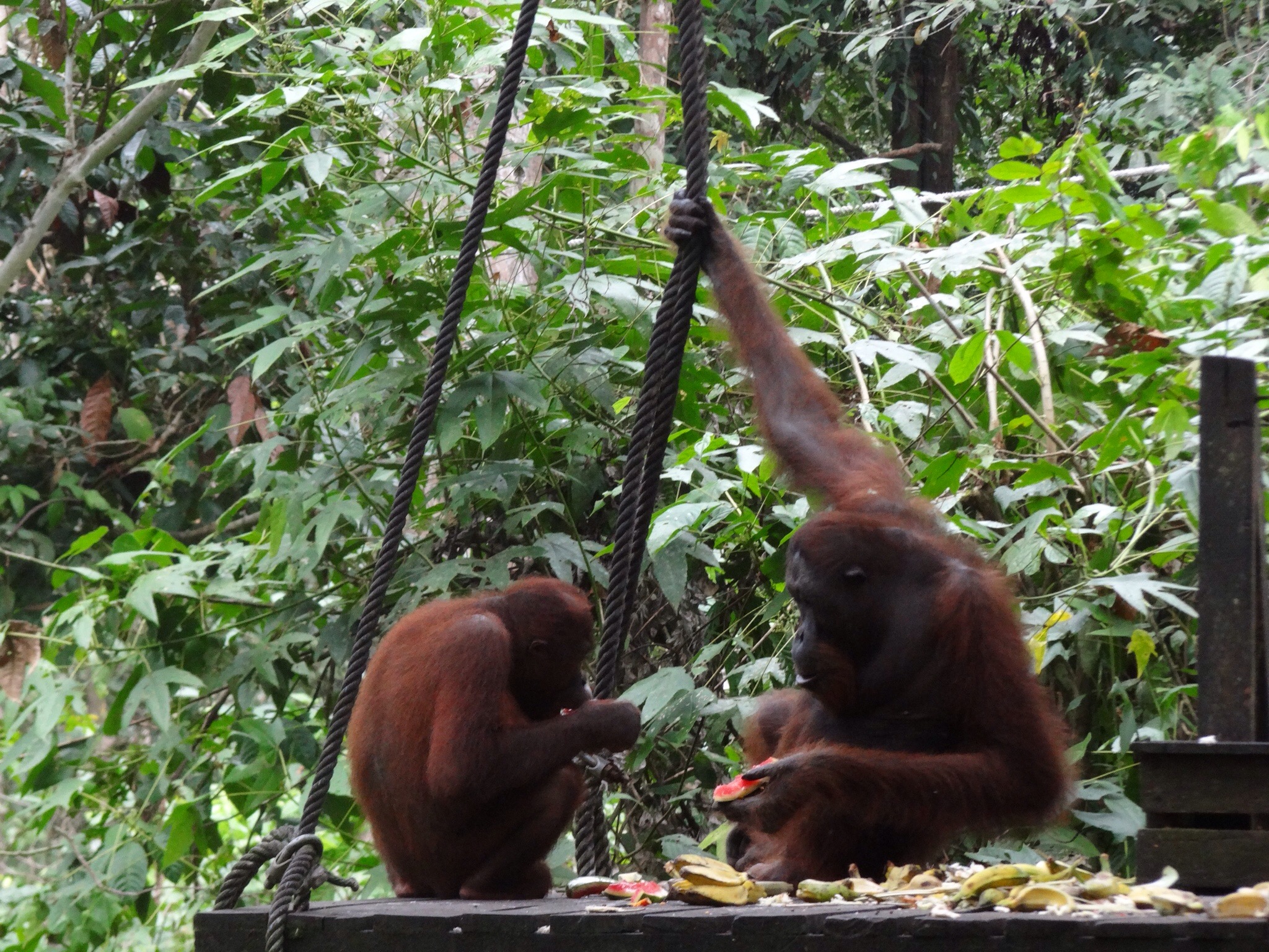 Once they are old enough, they are encouraged to venture further out into the reserve. Routine feedings are at 10:00 and 3:00 at platforms around the sanctuary to motivate the adolescents to move further away from the nursery. Some of the more confident ones will eventually leave the area altogether and still others will spend their entire lives in the vicinity. The orangutans are free to roam all day every day, but when a caretaker emerges onto a small wooden platform and dumps a basket of fruit, mostly bananas, watermelon and papaya, you won’t hear or see anything special at first. Then, suddenly, silently, a large reddish golden shape appears in a tree or from under a bush. One climbed the same ladder that the caretaker used to reach the platform. Another one acrobatically swung from rope to rope until he finally reached the fruit. They sat with their backs facing the anxious, camera-wielding crowds and completely devoured the pile of treats, albeit in a very civilized manner, patiently peeling each banana. A rogue proboscis monkey stole a banana or two, but the orangutans had their fill and were willing to share this time.