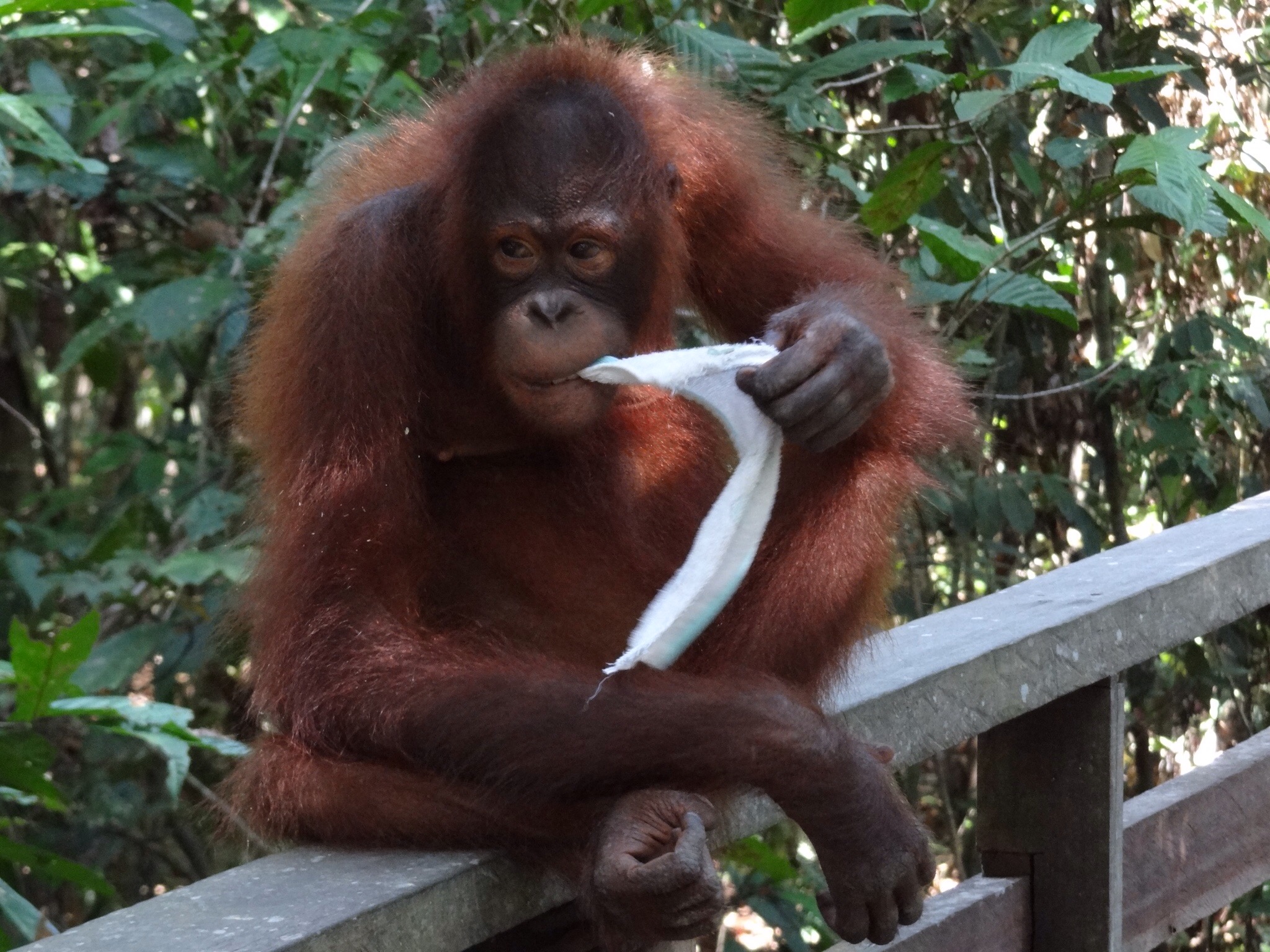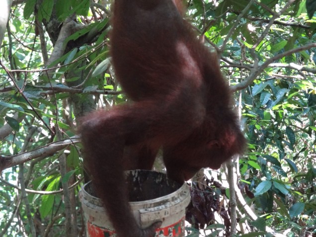I enjoyed the morning so much that I went back two more times before I left Sepilok. I saw a mother and her baby swinging through the trees, practicing basic skills. I saw an adolescent “naughty” orangutan steal a large plastic paint bucket and use it as a hat. Another one stole a towel and used it to rub his head and face like he may have seen his caretaker do. There were at least four in close proximity to the wooden walkway, curiously watching us watch them. Few wildlife experiences can quite match a day at the Sepilok Orangutan Rehabilitation Sanctuary. It was pure bliss.