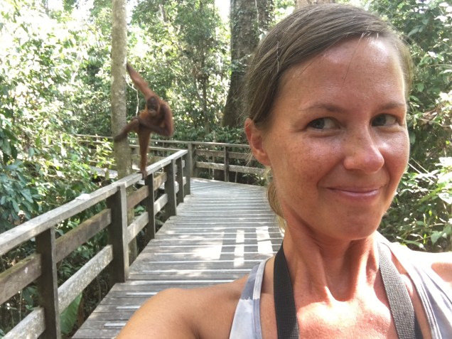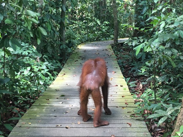 Three visitors were stopped in their tracks. An orangutan had stationed herself on the walkway while she ate some nuts and berries. My jaw nearly dropped and I’m sure the others felt the same. What a powerful moment to be so close to such a gentle magnificent creature.