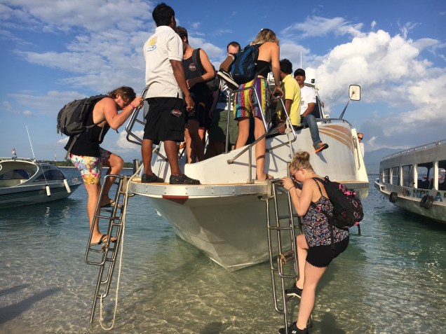 The Gili Islands are a small trio of land masses, only blips on the map really, that somehow support a population of 3,500, yet host several times this in tourists to share the sun, sand, marine life, water activities, and notorious wild parties. To get there, you can either fly to Lombok, the larger adjacent island with an airport, or as most people do, you can take a fast boat from Bali. For me, this took the better part of 6 hours, not due to the distance but purely due to typical disorganized time schedules and disinterested boatmen. Scheduled to be picked up at 10:00, I waited until 11:00. A 90 minute drive from my hotel in Nusa Dua to the pier at Padang Bai, followed by another 60 minute wait, nearly 2 hours on a slow “fast” boat, making two stops at both Lombok and Gili Air, before finally arriving on Gili Trawangan. The top of our ferry was loaded with drunk passengers by the time we arrived so watching them maneuver down the unstable metal ladder was interesting, to say the least.