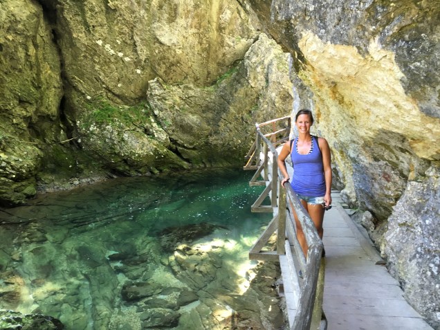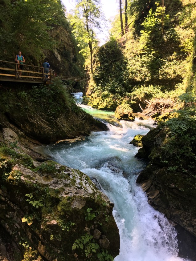 Vintgar Gorge is a short(ish) walk or bike ride away. We walked, although I will state for the record, there is no shade for the entire route. Depending on what time of year one visits, the heat can be unbearable and make the walk seem ALOT longer. Drenched in sweat by the time we found the park gate, Martyn and I were busy thinking about ice cream and cold beer rather than the natural attraction we had walked all the way to admire. Narrow wooden platforms have been constructed along the walls of the gorge, turbulent gushing water under our feet. It was really a beautiful place. The shadows at that time of day unfortunately wouldn’t allow the photos to do it justice. And because the walkways were so narrow and they were meant to service an out and back path, the foot traffic would bottleneck, leaving a strong sense of claustrophobia. Luckily, the shadows were a relief from the heat and if we needed a break from the crowds, there were a few spots to get closer to the water.