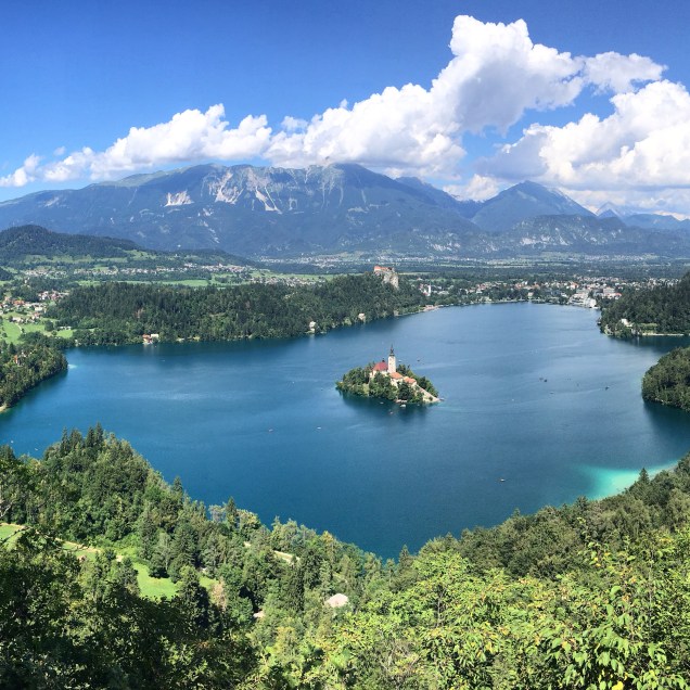 A first glimpse of Lake Bled appears something out of a fairy tale. A majestic castle towers over everything below. A glacier-fed lake is the centerpiece. And a romantic little church on an island in the center of the lake is the cherry on top.