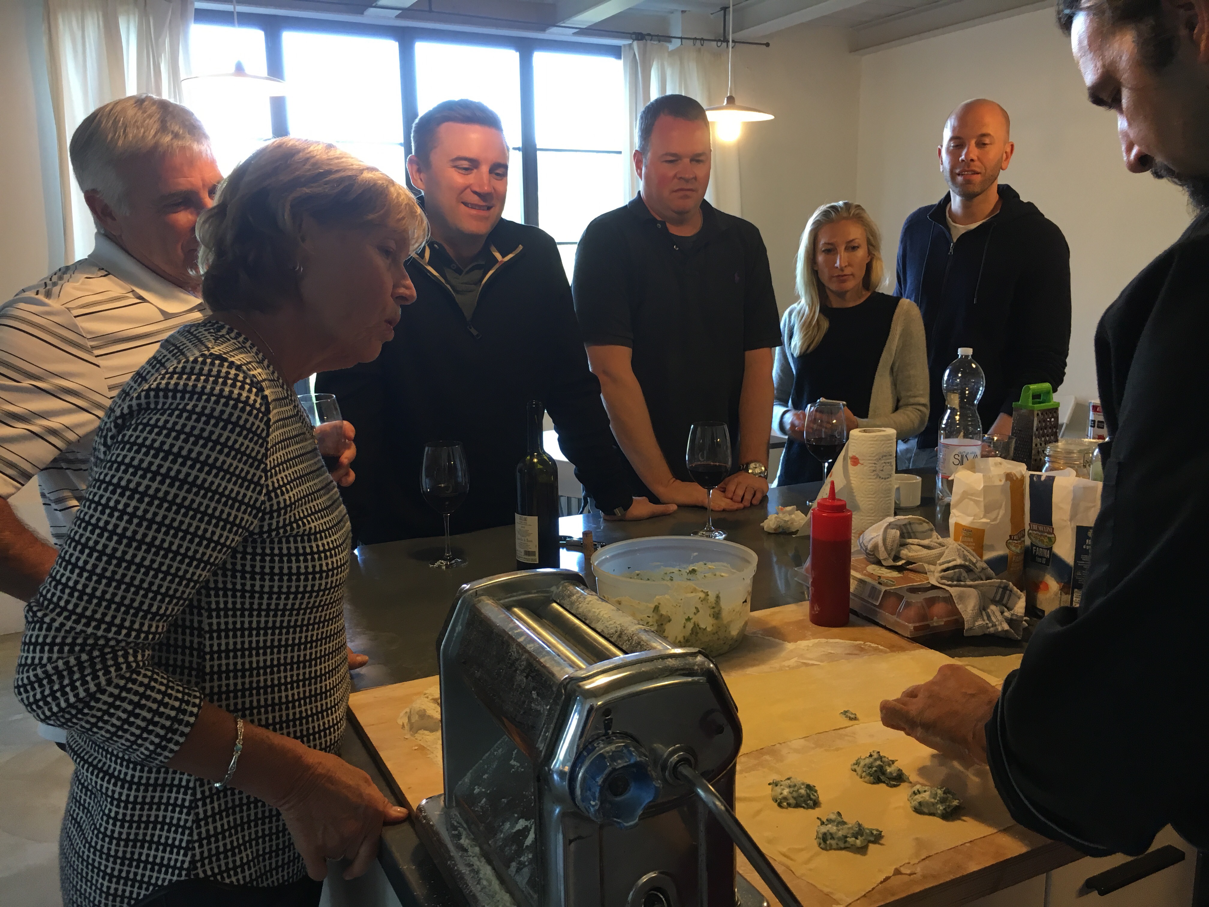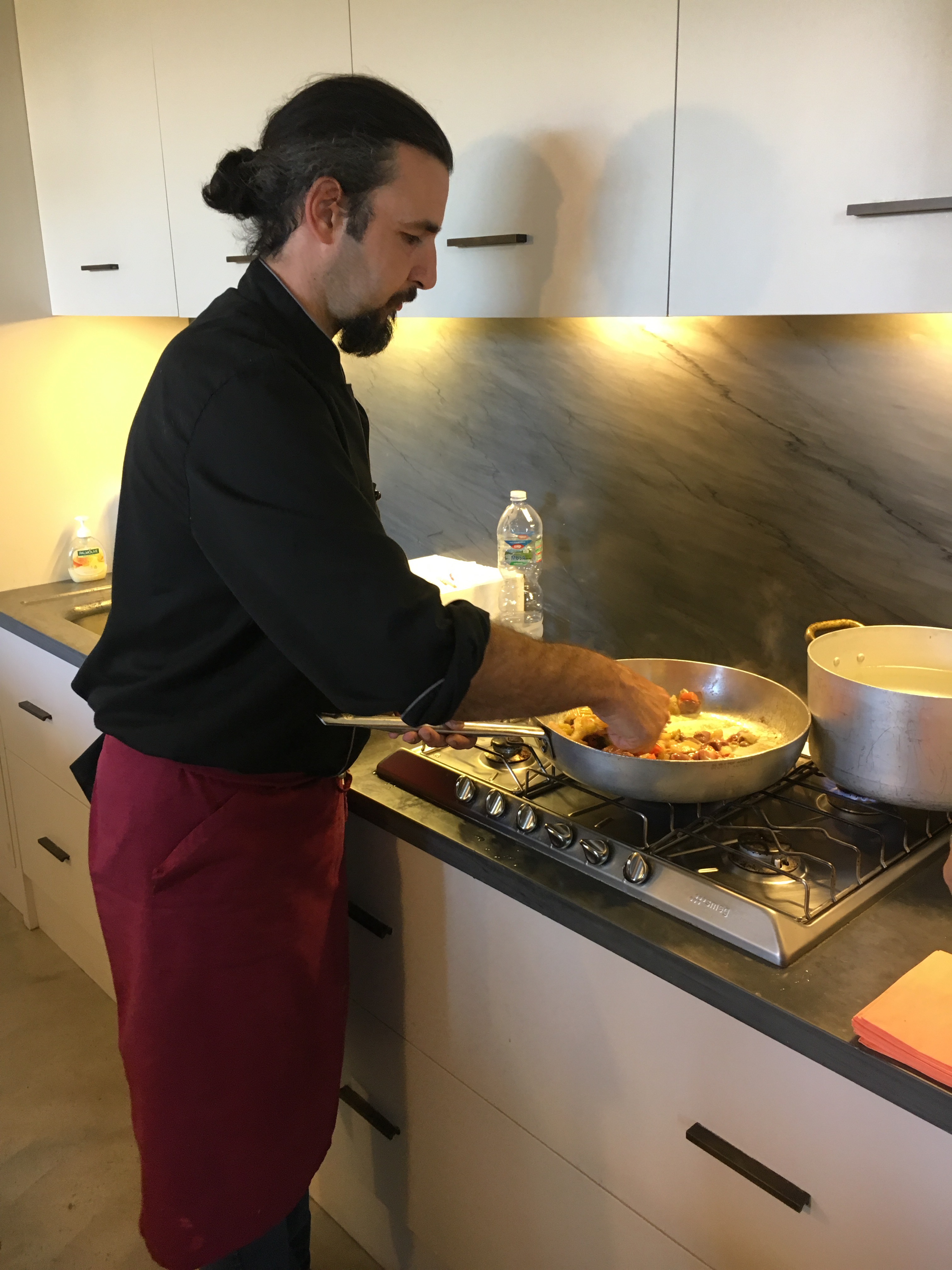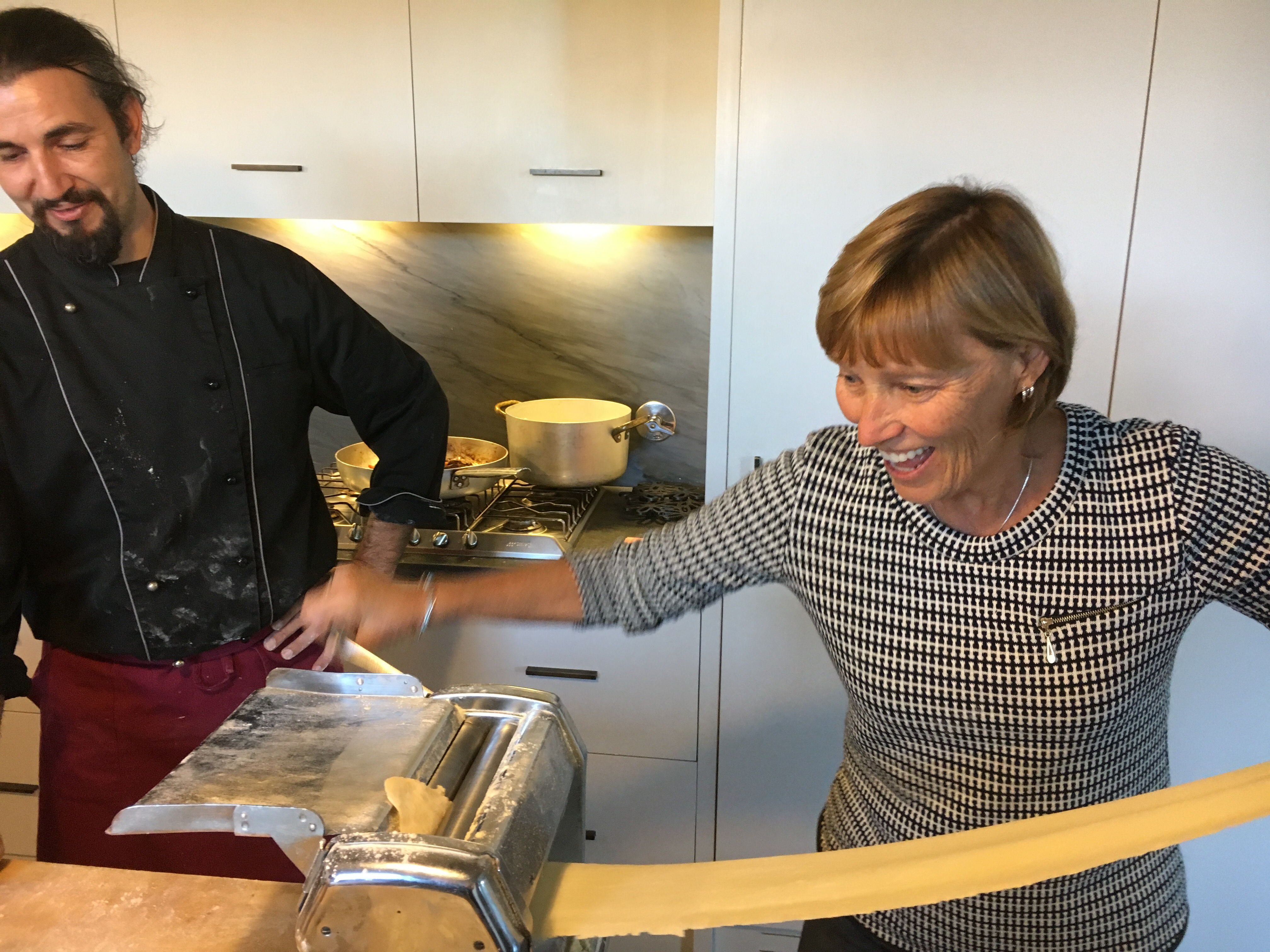 For a special celebratory night, Crissey arranged for Chef Boris, accompanied by his wife as translator and his two teenage children as sous chefs, to make us dinner. It was intended to be part lesson and part family dinner, but Boris, who spoke virtually no English, was more a part of that meal than the tomatoes in the sauce. He was soft spoken and modest, but he commanded every tool and ingredient to dance with perfection. His hands were caked with dough as he kneaded the pasta and his red apron hid the bright red tomato stain splatters. He prepared chicken liver pate to spread on crusty Italian bread, spinach and ricotta ravioli topped with chunky tomato sauce and shredded parmesan, roasted beef, and a decadent pear strudel. This was exactly what I had always pictured when I thought of a Tuscan dinner.