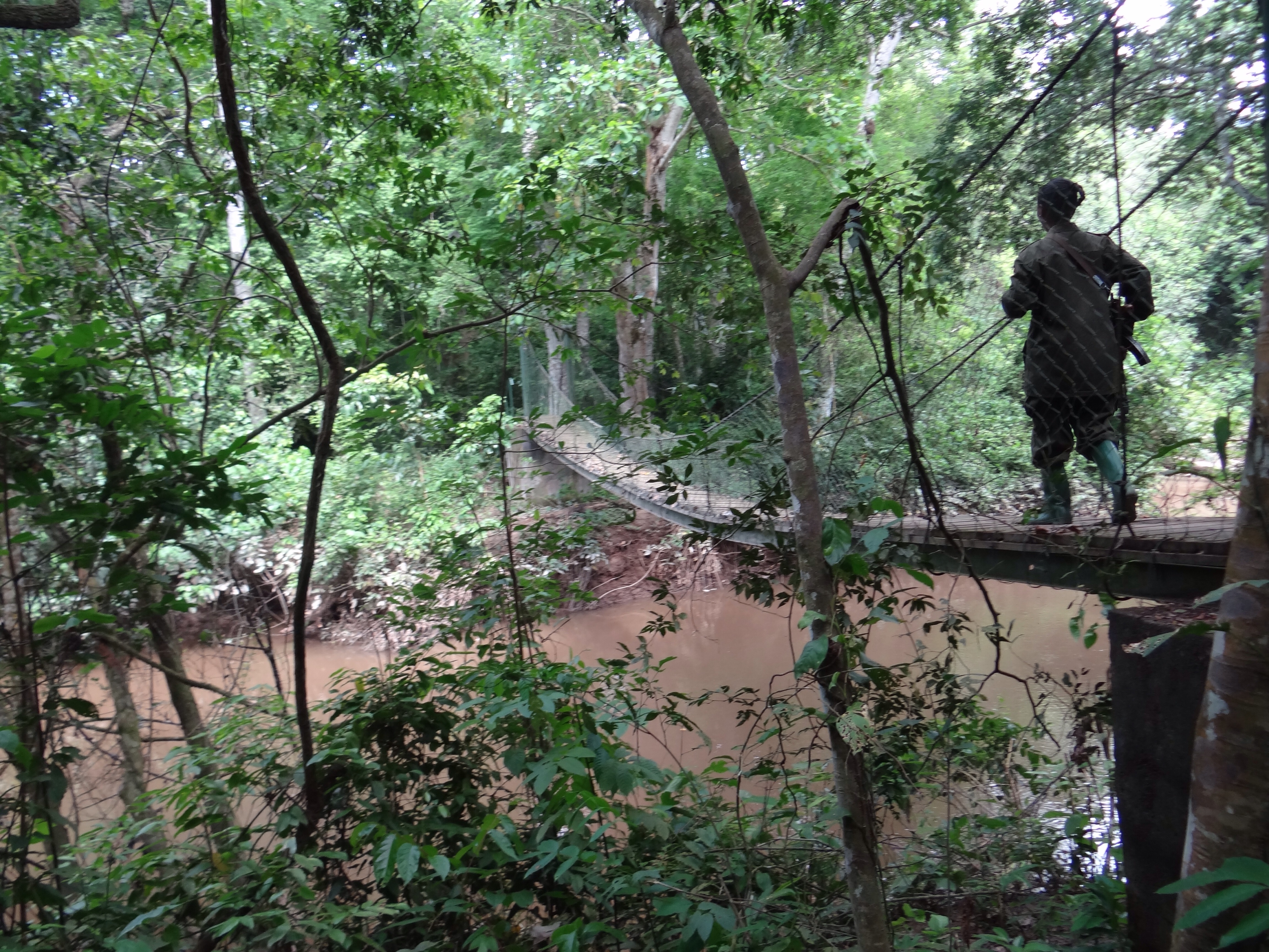 I had tempered my expectations for a chimp sighting, knowing that if we were lucky enough to be graced with their presence, they would be high up in the trees. Indeed when we found them, they were swinging through the treetops, fully aware of our every move and hollering to each other as they watched us watching them. Then something remarkable happened. One of the adult chimpanzees came to the ground and situated himself about 5 meters away chewing on a fibrous bush. He seemed relaxed and ignored us now, but for several moments, we had the rare privilege of seeing a chimp on the jungle floor. A rustle in the bushes behind us revealed another chimp and then another. All three effortlessly glided through the tree roots and thorn bushes and walked along the same path our tiny group had been using. Our guide’s face lit up as if even she was thrilled to see such an amazing sight. She motioned us to follow so we slowly, deliberately hushed our steps as we tried to mimic their movements. Much faster than we could ever hope to be in a harsh jungle environment we lost them when they crossed the river on a fallen tree. No matter, I was beyond satisfied with a fantastic encounter.