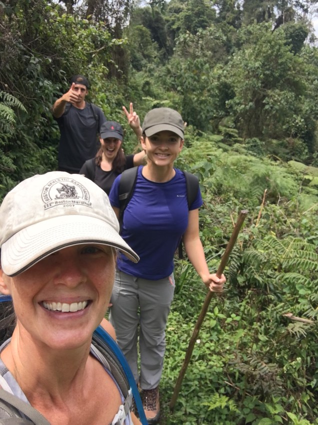 Two scouts go before sunup to begin the long search for the gorillas. Based on where they knew the gorillas were from the previous day, the scouts will use tracking techniques – footprints, droppings, location of nests (gorillas sleep in nests on the ground because they like comfort too!), a path of crushed vegetation – to locate our assigned family before we have even started walking. Unlike the earlier gorilla trekking when this tourism had just begun to draw international guests, the trekkers with their guide would just start out tracking for themselves. It would take hours through an indirect route and the possibility was a lot higher to not see gorillas at all. With this new method of pre-scouting, we could take the most direct route so we were virtually guaranteed.