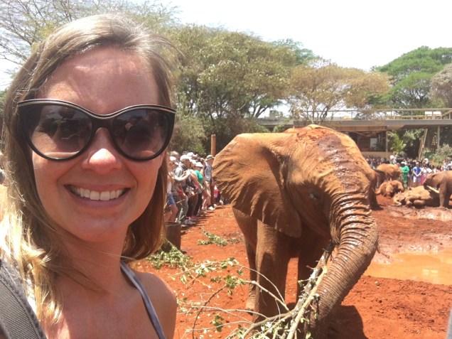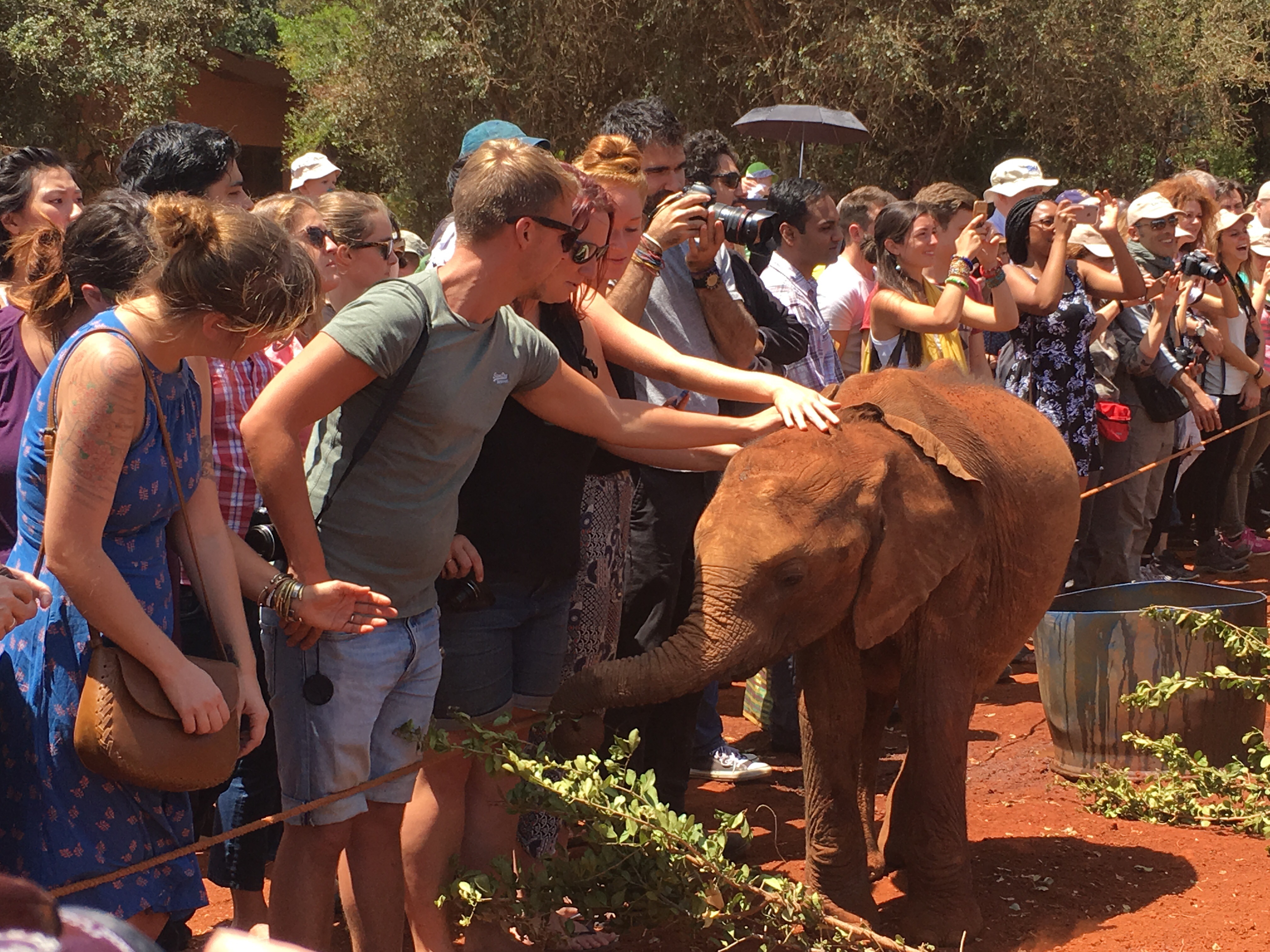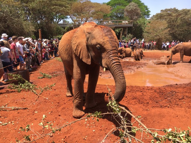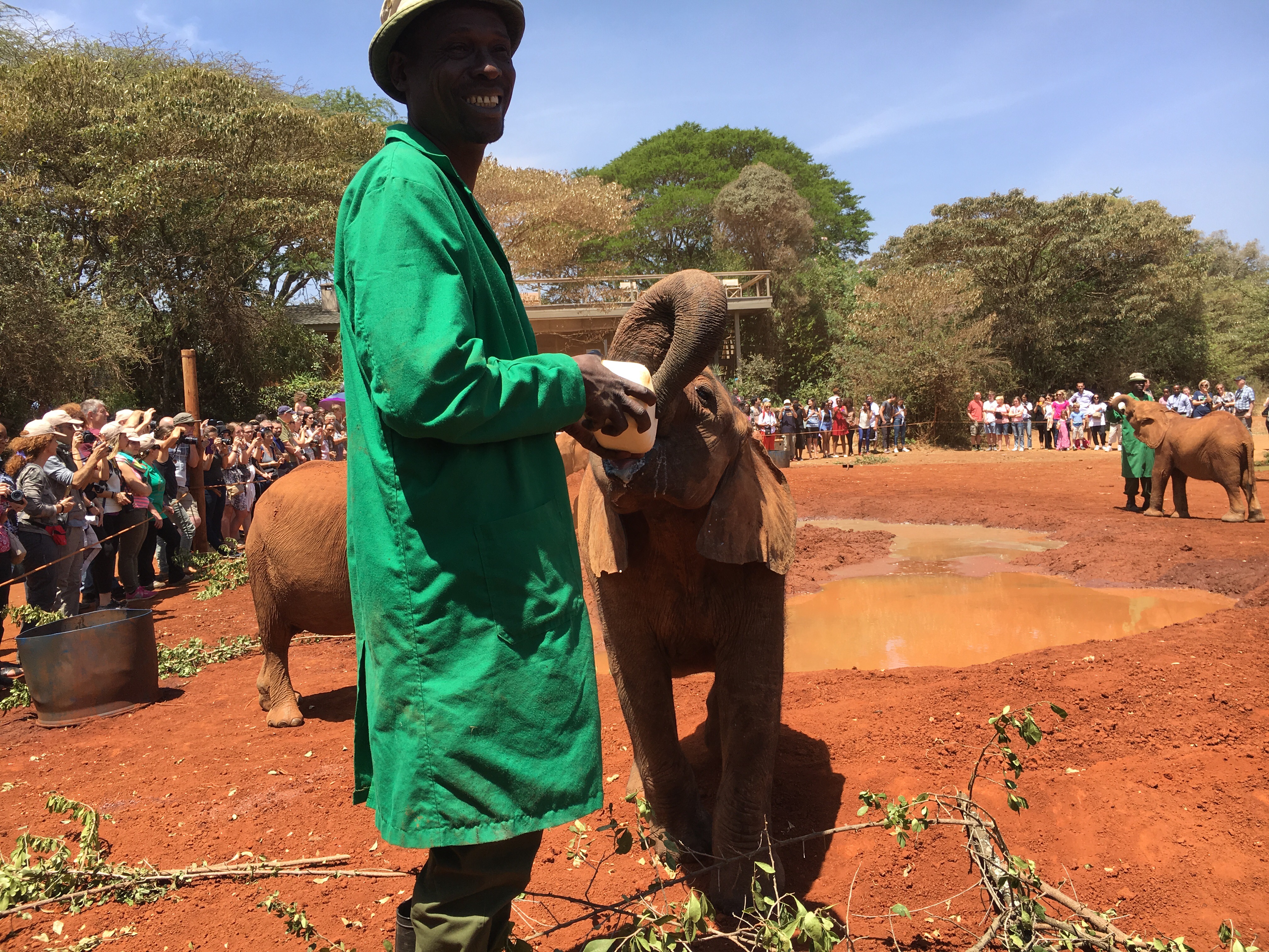 A few kilometers outside of the bustling metropolis of Nairobi, a thin rope was marking off a rather large plot of amber-colored mud and two manmade mud holes sat in the center while our Acacia group rushed to the perimeter to get spots close to the front. As if on cue, one baby and then another and another, twelve babies in all, came running into the exhibition area. The handlers fed each of them from a bottle the size of a milk jug and the more ornery of the bunch would try to sneak a second one from the wheelbarrow serving station. Full up with sustenance, they would then enthusiastically dive into the mud and roll around or sample greens from some thorn bushes that were on the buffet.