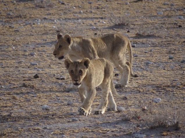 The next day our guide and driver wanted to start at 7:00am. I found this rather irritating because the park opened at 6:15am, right at sunup and precisely the time when it’s possible to see the most animals. The later you leave for a safari, the fewer your chances of spotting the best game. Two of us who had safaried before begged our guide to reconsider, but frankly, I think he was lazy and insisted 7:00 would be better. Next we turned to our fellow safari goers to encourage them to be ready earlier. Their expressions were bland, yet to my surprise, all 14 of us were ready by 6:30 looking to our guides for the green light. Our safari truck pulled out of the campsite just as the sun was hitting the horizon and within moments, our guide said he spotted a couple of cheetahs walking across the barren plain. We stopped to watch. They were coming toward us. They weren’t cheetahs after all – it was a female lion and three playful cubs. They walked closer and closer until they crossed the road right in front of our truck, all while the cubs wrestled with each other and tried to get mom’s attention. See what we would have missed if we had left any later??