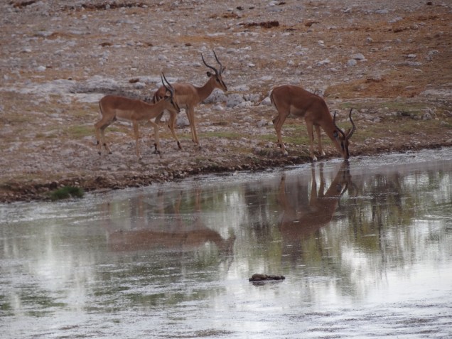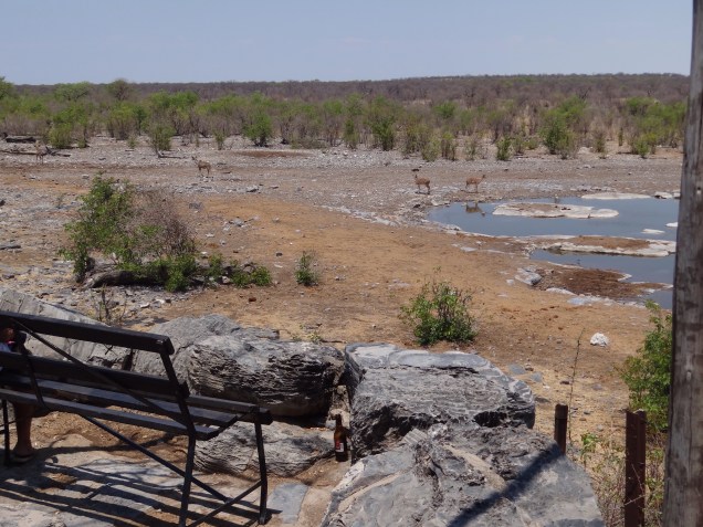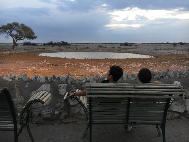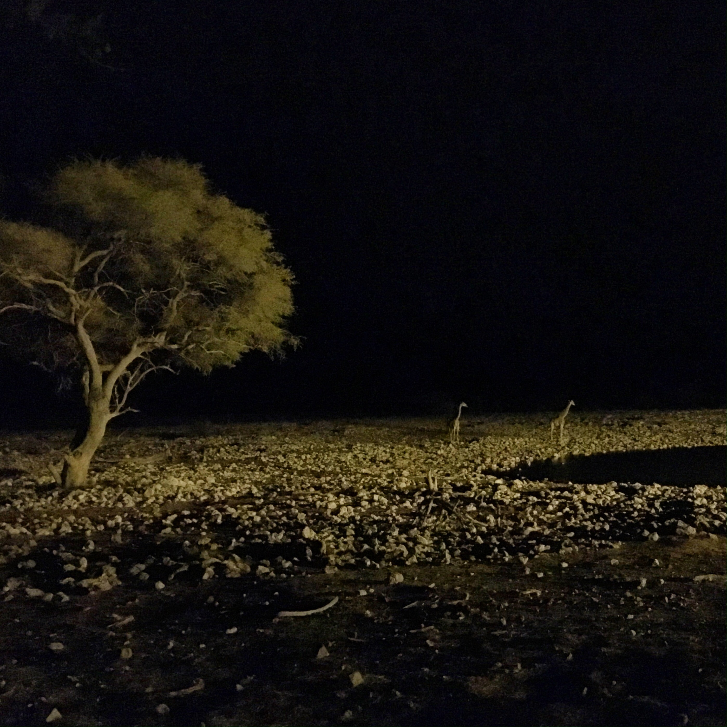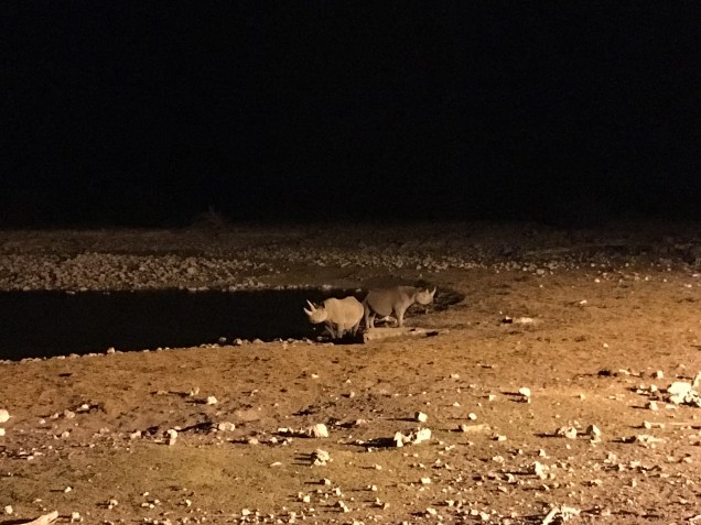 Etosha is best known for its illuminated waterholes. I had heard it wasn’t much more than a glorified zoo, the landscape manipulated and the roads constructed to further tourism, strategically running next to natural and manmade waterholes throughout the park. In a dry desert landscape like Etosha, a waterhole is the most natural place to spot the most wildlife. Everyone needs to drink. Likewise, our campsites were also situated near waterholes, but the tourism board didn’t stop there. At night, the waterholes are lit with a spotlight to imitate moonlight and big wooden benches are set in a semi-circle behind a natural-looking barrier. You can stay all night, if you choose, with a glass of Cab and a cheese tray. I could somewhat see the comparison to a zoo except we were the ones caged inside and the animals were the ones roaming free. But the similarities stop there. I had intended to stay for only an hour and then until I could see a large mammal and then finally I pulled myself away when it was well past my bedtime. This was a much better show than any zoo could pull off.