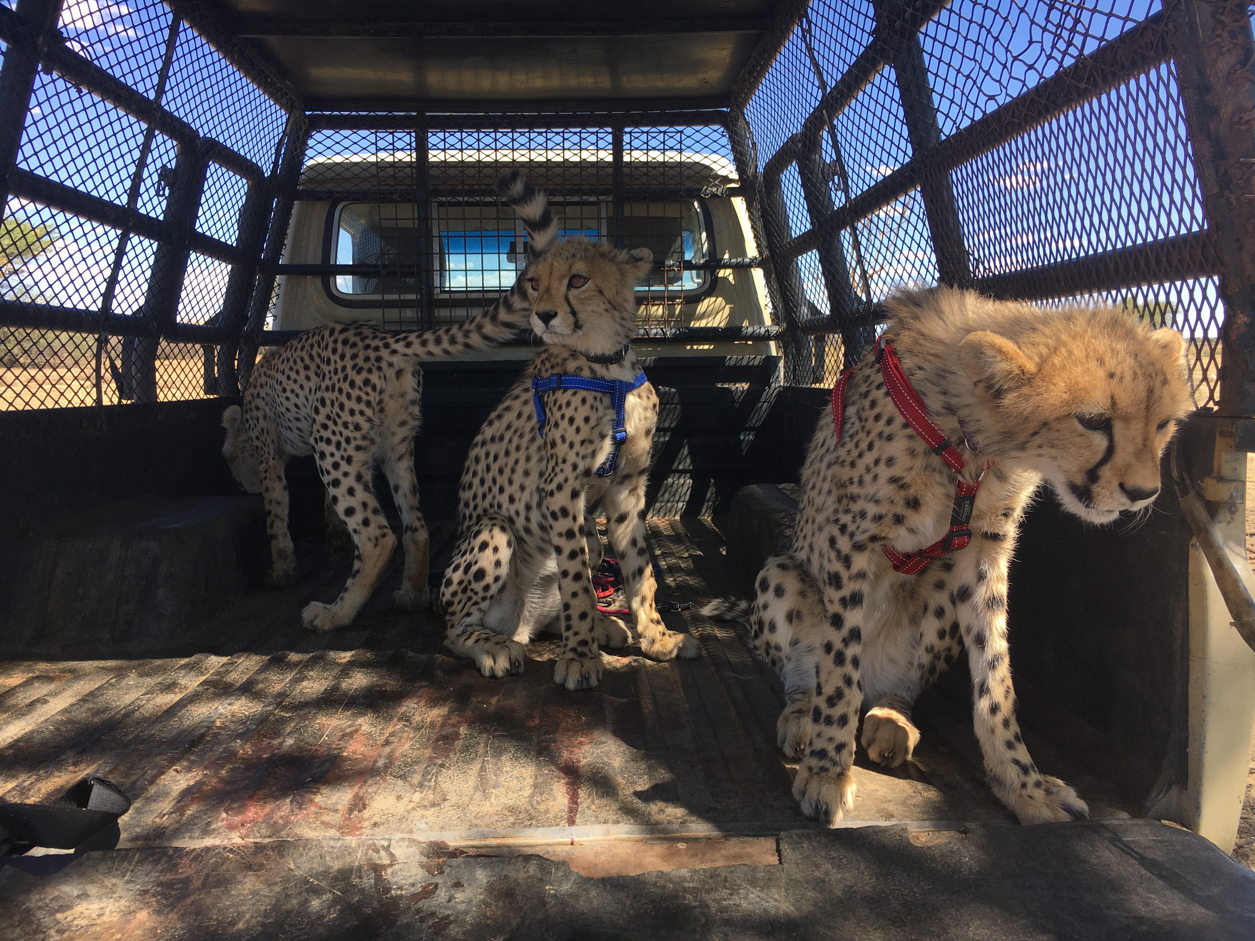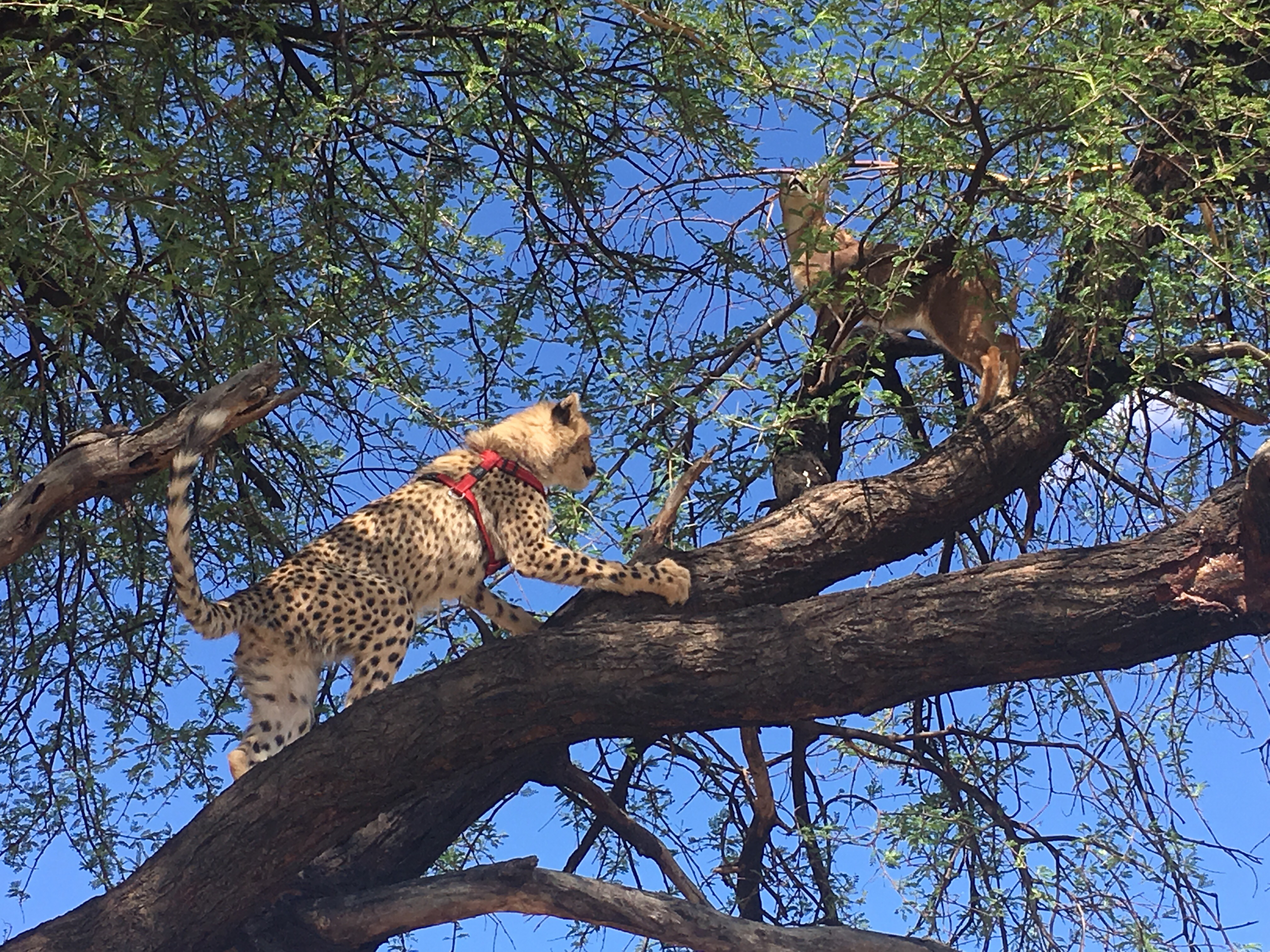 The cubs are currently all housed together in one enclosure away from the farm so we drove to pick them up in the back of an enclosed buggy. Only six went on the walk, accompanied by six volunteers, a caracal kitten, and a dog, all shoved into the cozy buggy cage for the short drive to the waterhole on the property. Some of the cubs were very relaxed on the drive and some were anxious, darting from one side of the truck to the other to see where we were headed. When we arrived, coaxing the cubs out of the buggy was another chore. The dog was the first one out, followed by caracal, but the cubs just hung back together demonstrating their inherent skittish timid cat nature. The ‘walk’ isn’t so much a walk but a supervised playtime where they can explore their environment outside of the enclosure. Ever so slowly, over the course of the next couple of hours, their confidence grew from hovering in the back of the buggy to climbing trees and wrestling with Misty, the caracal, to all six chasing a full grown wild ostrich off into the bush. Those cubs didn’t have a prayer of catching the ostrich, let alone harming it. If anything, the ostrich could defend itself with a swift kick to the head. But….to see those optimistic young cheetahs scare an adult male ostrich into an alarming run with feathers flapping in the wind…that is something you can only hope to see once in your life. On another walk, a couple weeks later, the cubs noticeably bigger and more mature, they pulled the same stunt stalking and chasing full grown wild giraffes. It was amazing to see their natural instincts take over even though their skills are clumsy at best, but considering their choice of prey, actually quite dangerous to their own well-being.