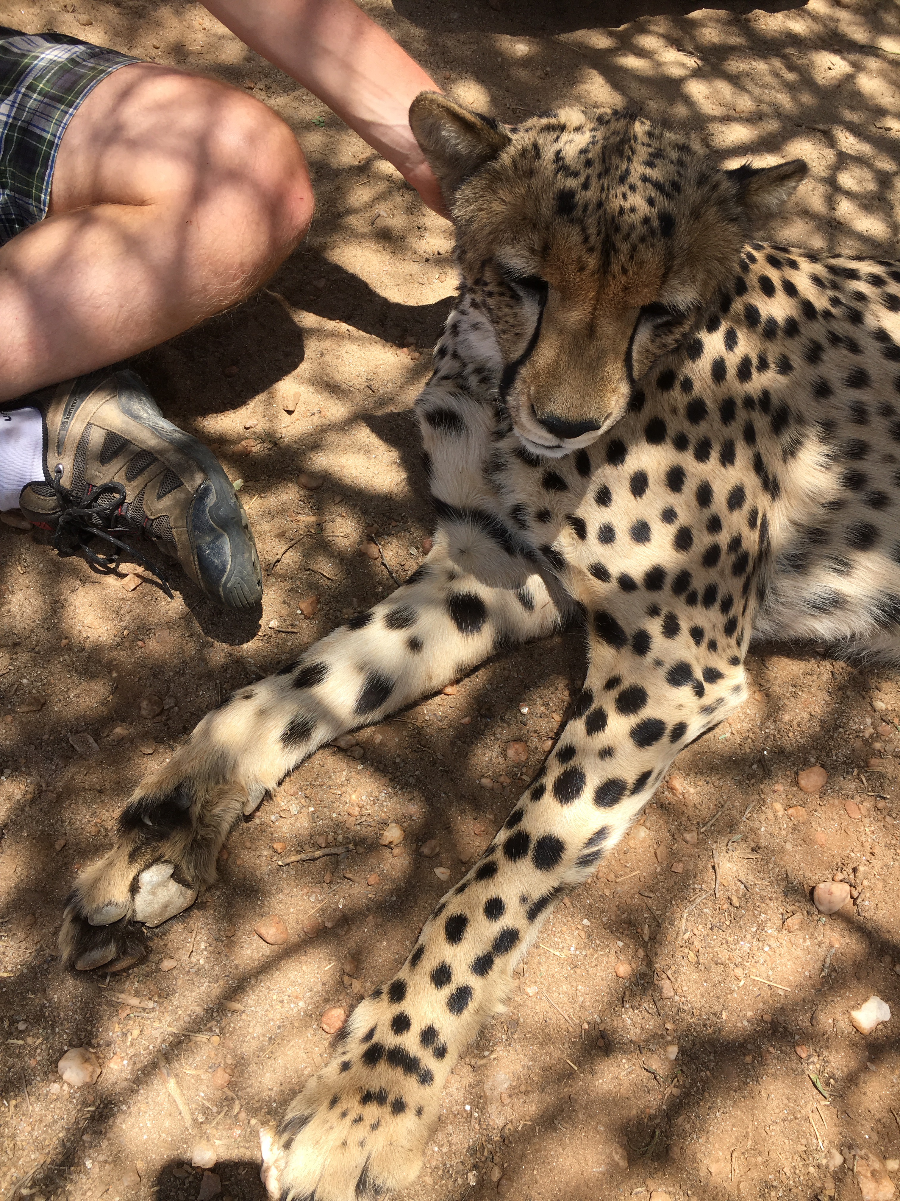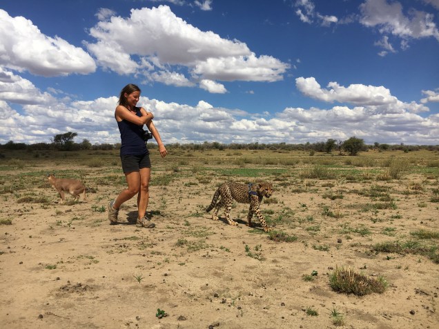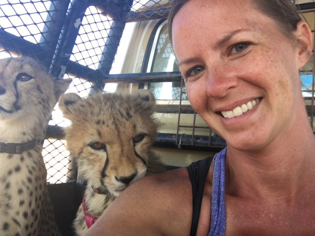 My very first afternoon on our job board, my activity was listed as “Cheetah Time.” Frankly, I didn’t even really care what that meant, but it sounded like exactly what I came for. My group, labeled Kudu, that consisted of Mirijam, Sandra, and Elian, plus another group of four people walked off the farm, through scrub brush and desert, toward a massive natural enclosure. Thin metal fencing with a low power electrical charge enclosed the natural environment of the desert. No concrete barriers, no heavy bars in sight. Without hesitation, Abraham, our leader, unlocked the padlock and ushered us inside. Almost immediately, two majestic cheetahs raised their heads from resting in the shade and approached us purring like a jet engine. They both plopped down right at our feet in the way only a cheetah can collapse its long limbs in one swift movement. Abraham had been less than communicative as to what we were supposed to do now, but following the example of more senior volunteers, we too sat down in the dirt and spent the next two hours rubbing them behind the ears while they slobbered their sand paper tongues up and down our bare arms. It was Wonder and Odyssey, who had been hand-raised since the tender age of 1 day old. Their mother had been diagnosed as diabetic and couldn’t produce the milk needed for their survival, along with their sister, Shiloh. Hand-raised cheetahs grow up with the temperament of a domestic cat, making them very appealing candidates for the illegal pet trade, but sadly any cheetah that has been hand-raised and has become habituated to humans can never be released back into the wild. Kitty was also in the enclosure, but she was more nervous having been rescued at five months old after her mother was struck and killed by a car. Stroking those cheetahs* for nearly two hours, solely because they crave the daily affection, was pure magic and certainly couldn’t be classified as “work.” I was in heaven.