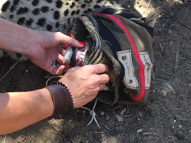 The staff bus was commissioned and off we drove toward the capital of Windhoek. The Namib Poultry Farm was on the other side of the city so it was about 90 minutes from the farm. Marlice drove her jeep with the necessary gear. We were greeted by the farmer and his wife to show us where the leopard was waiting (and had been for 2 days already). Marlice and a couple other professionals approached the cage with a blow gun. Generally they use a dart gun, but the dart canister was empty. Marlice was going to try to tranquilize an unhappy cat with a blow gun. We watched from a distance when she came back laughing at her apparent failure. Next, she filled a syringe. Low on supplies, she had rapidly shifted to Plan D of tranquilizing the leopard by hand with a small syringe. Don’t try this at home, folks.