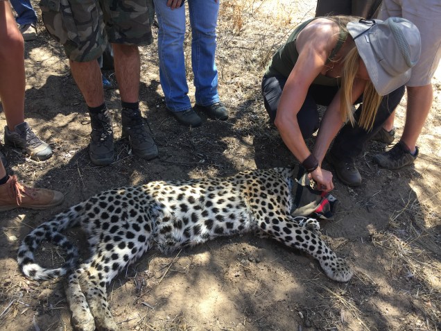 After her examination, we were to move the leopard again so she could reverse his cathartic state and we could return to the farm. I happened to be standing in the right place at the right time when she asked someone to pick him up. I scooped my arms under his backside while someone else grabbed him from the front and shuffled back to the jeep. This leopard had been inside of a cage with a dead animal (the bait) for two days and he smelled as such. Therefore, having carried the warm comatose leopard next to my body, I too smelled like a dead animal. All worth it, right?