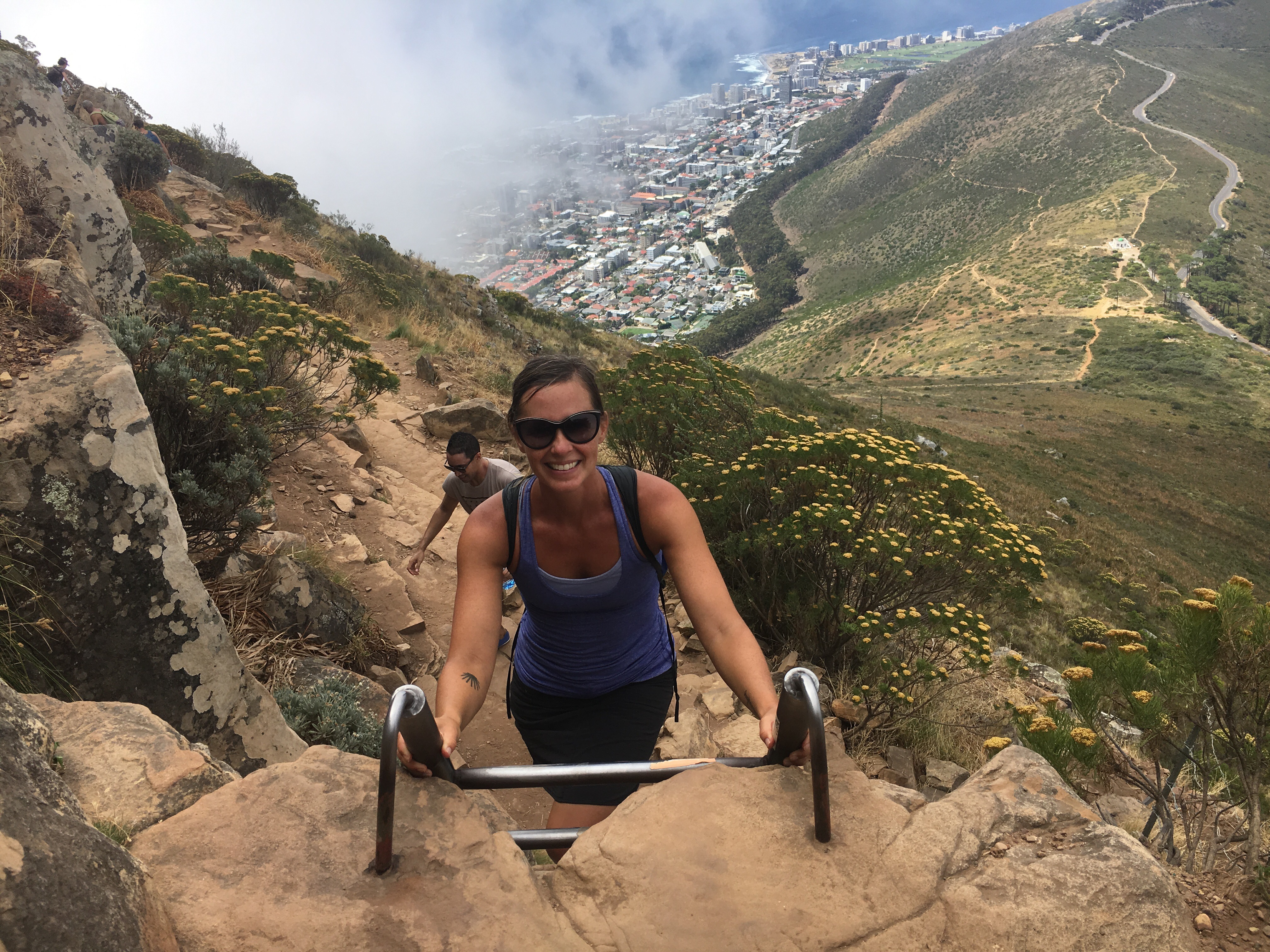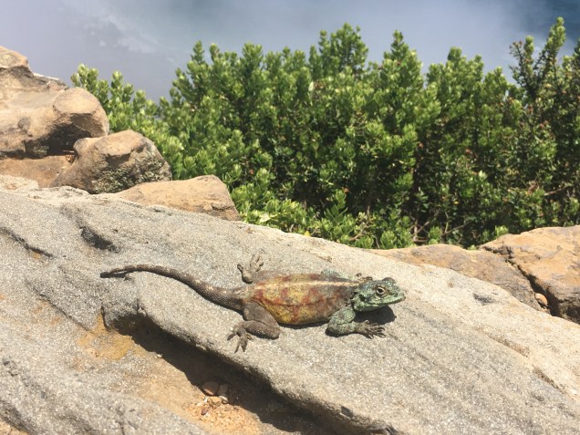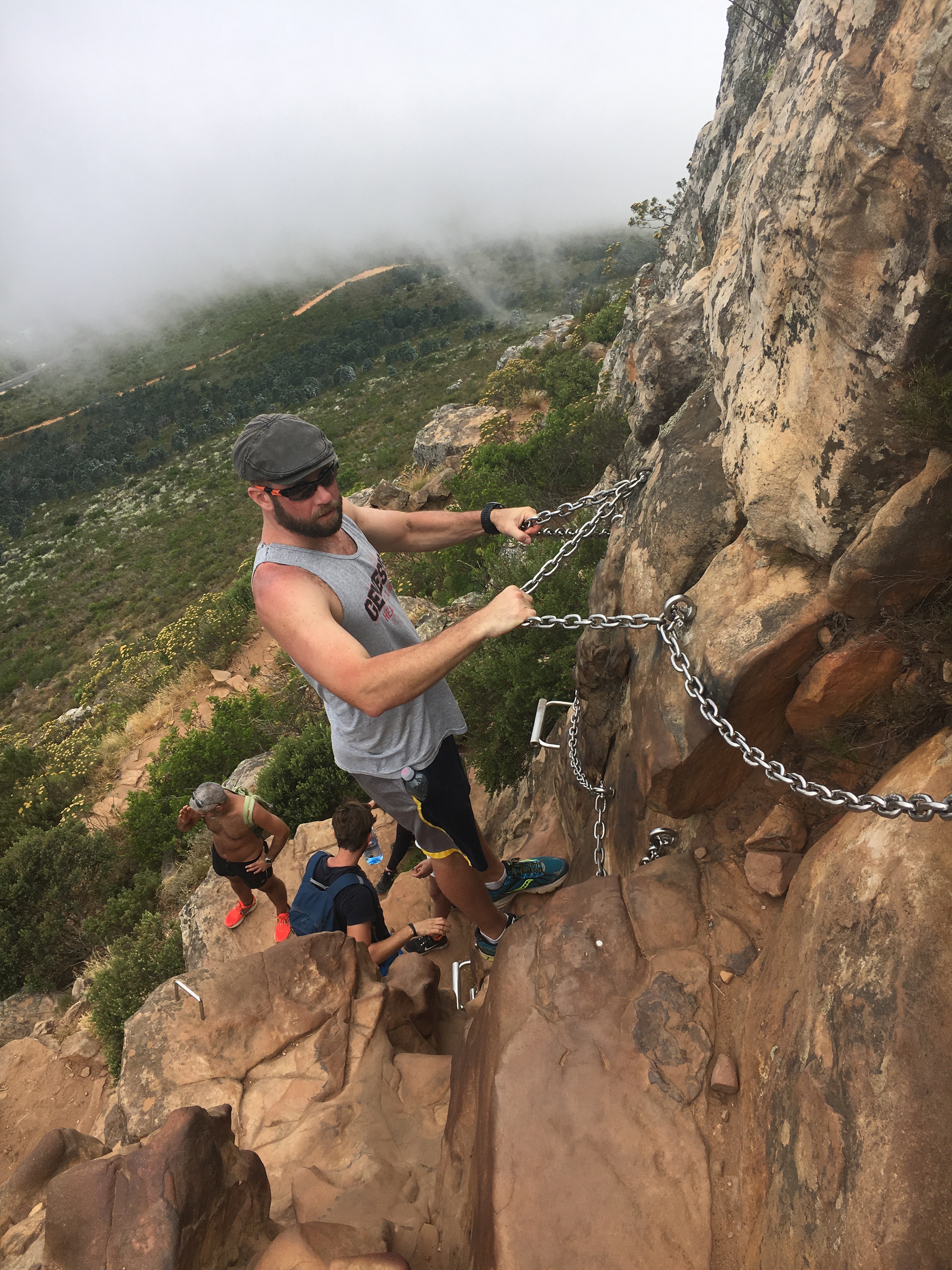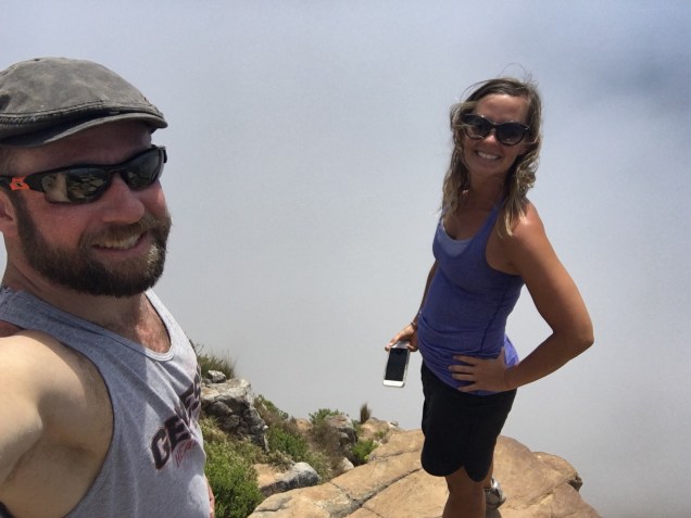 We circled the cone-shaped mountain on wide switchback trails; paragliders were sailing from the halfway viewpoint. The weather was perfect and the views showcased Table Mountain to the east and the Atlantic Ocean to the west. I made an amateur mistake by deciding to take photos on our descent instead of that moment while we were walking up. The perfect sunny day was about to change. Reaching the summit required some easy scrambling over rocky ledges; my shoes never would have survived without the tape. Steven and I reached the top only about an hour after I had taped my shoes, but that was exactly the the time that the clouds rolled in and completely shrouded the rest of the world from our view. The temperature dropped and I was completely chilled to the bone while we patiently waited for our luck to change. Pacing from one vantage point to another was futile. A chameleon watched me from a nearby perch and I watched him dance away into the fog. Steven and I took turns standing on a protruding ledge and snapping photos in the brief seconds when the clouds thinned out. This must be why a mid-day visit to Lion’s Head is not recommended. We gave it our best shot.