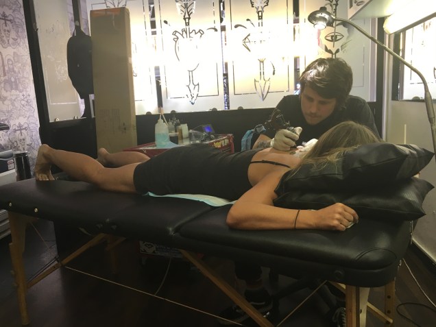 As the week wore on and Steven and I spent more time together, his thoughts were drifting toward a round the world journey of his own. He liked his job, but was convinced (as I was) that there is more to life than the 9-5 routine. On an impulse, he decided to get a tattoo. A symbol that was boldly displayed on the wall of the hostel, it was an incomplete red circle with a red dot in the middle. It is meant to signify that home doesn’t need to be just one place; it can be many places. This resonated with Steven and his mind was made up. I had been toying with the idea of another tattoo myself so it didn’t take much convincing to go under the gun as well. I knew exactly what I would get, but where did I want to get it? Just moments before we were due to begin, I sent a text to my brother back in Florida. Your cheetah tattoo is on which shoulder?, I asked. The left, he wrote back.