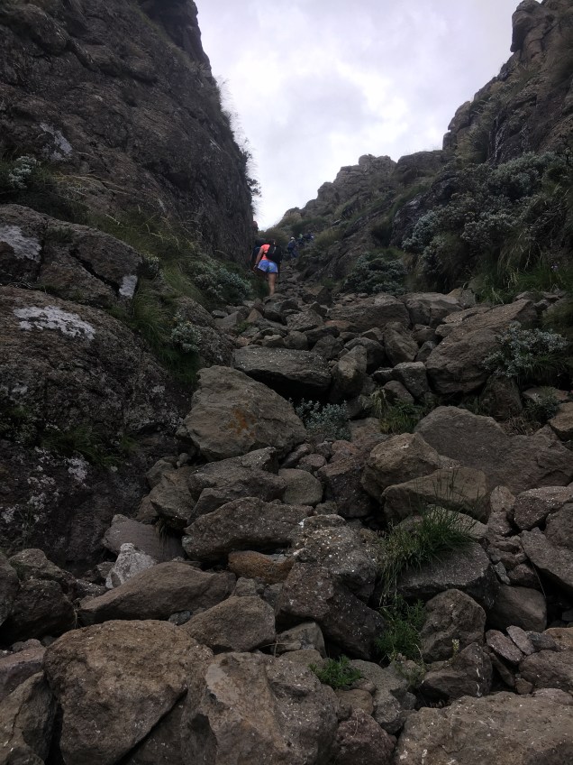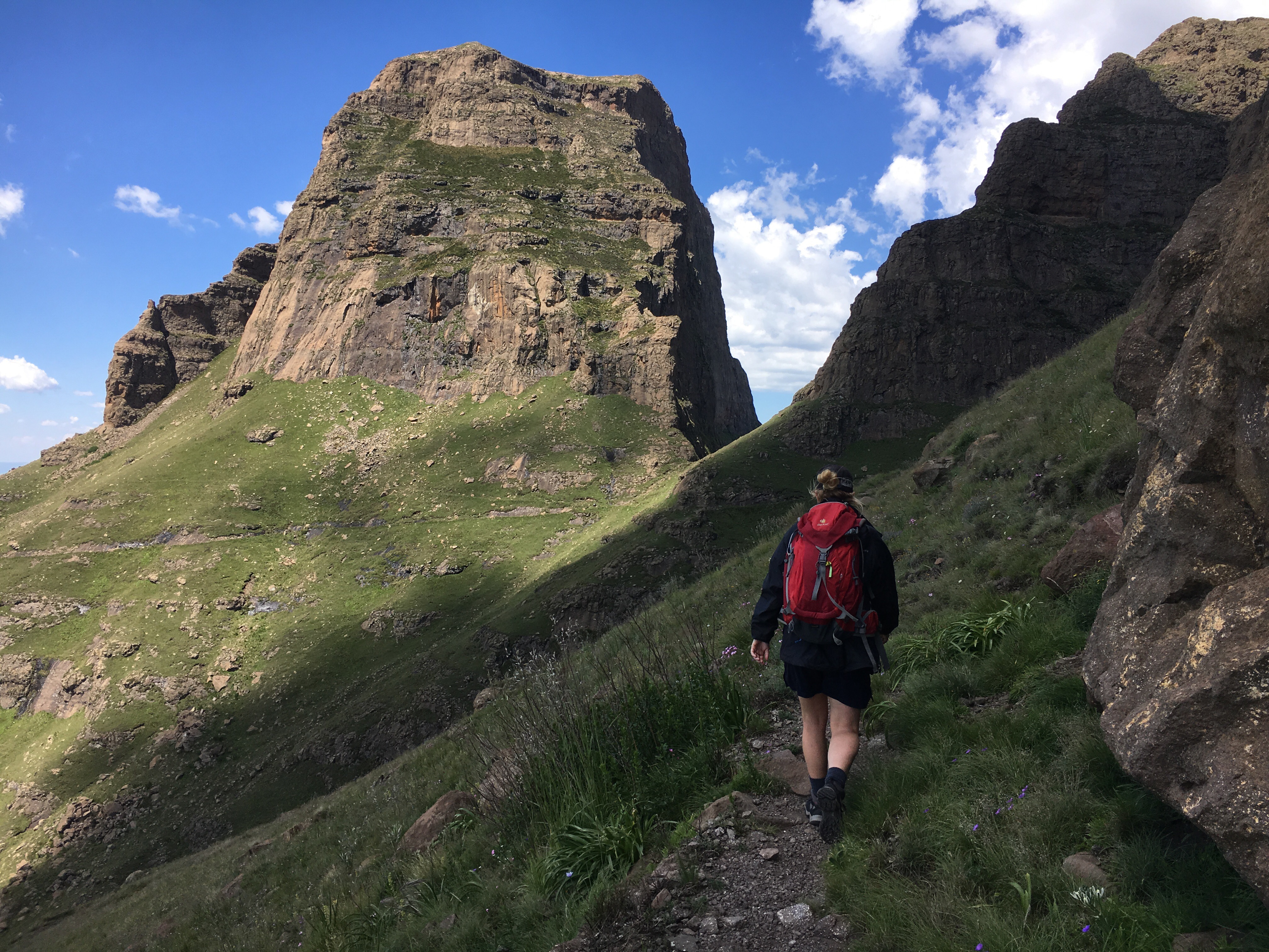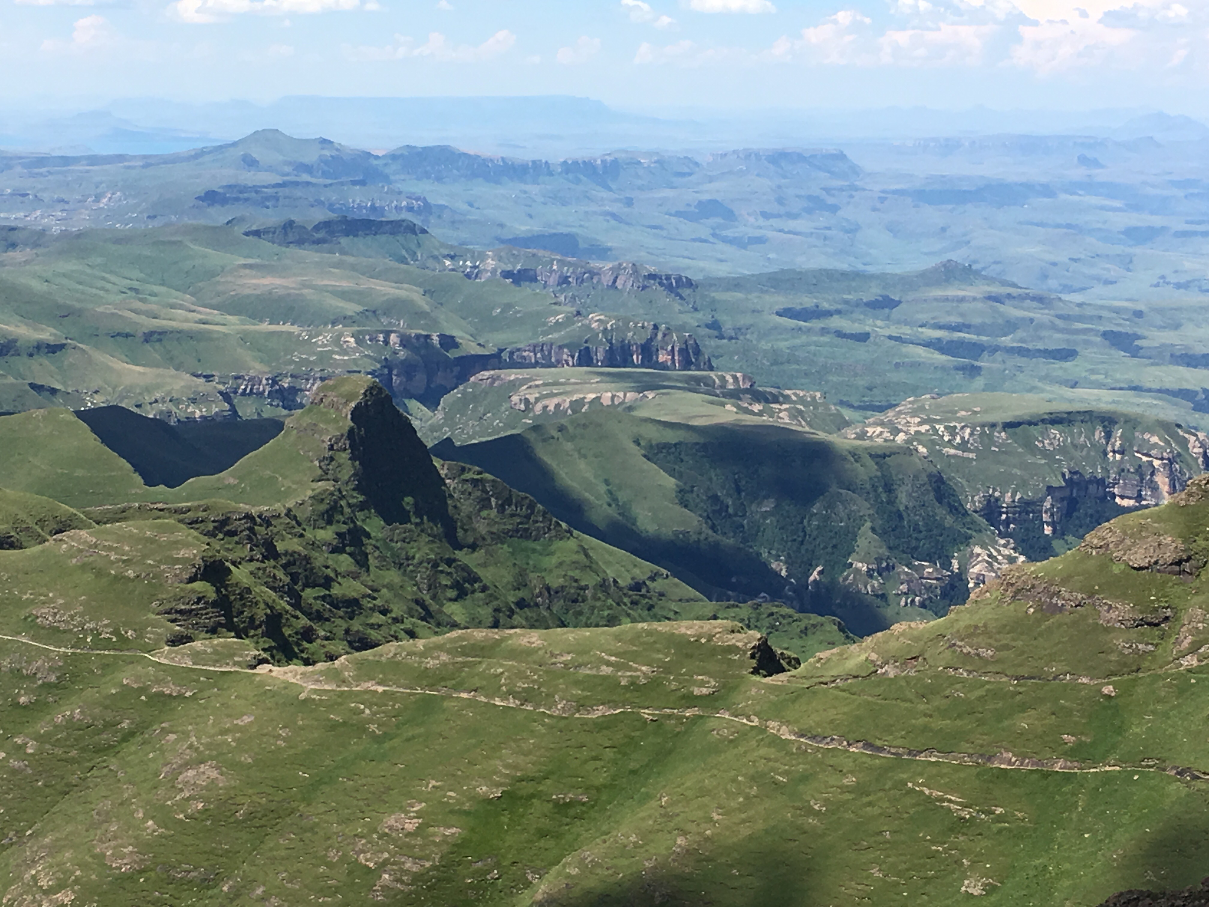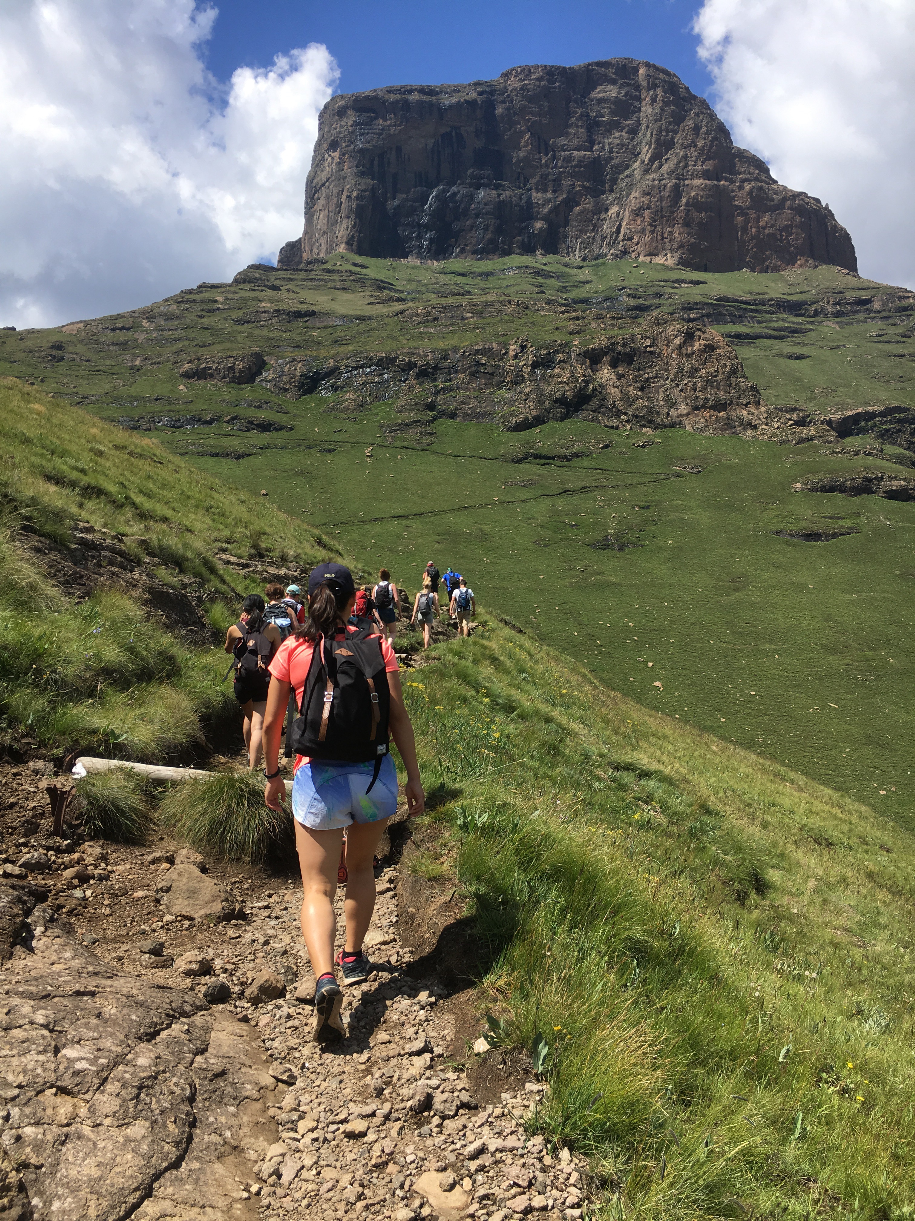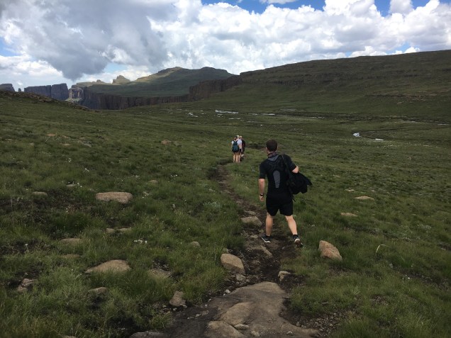We drove to Royal Natal National Park and parked a hop, skip, and a mountain behind the falls. We couldn’t see them, but we could see the massive plateau that we would need to climb up and over. The work ahead of us was clear. We were just on the edge of the escarpment so the landscape consisted mostly of undulating green mountains and the parking lot was already higher than most of them.
