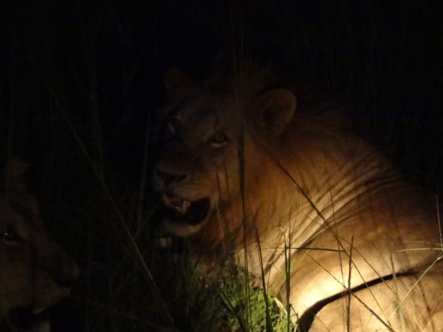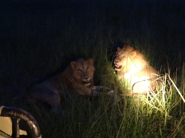 As the sun began to set, we were warned to stay close to the jeep in case the lions were about. The sky changed from orange to fuchsia to dark purple. With colors that vibrant, we were enchanted and warmed with bubbles from the sparkling wine before we loaded back in the jeep. The park has a strict policy of closing at 6:00pm and we were due to be stamped out on time when we heard on the radio that the lions did turn up exactly where we were looking for them earlier. This was a huge disappointment as we were too far away to turn back. But then something else…a few meters ahead another jeep was parked next to the road as the sky grew darker and darker. They were shining a spotlight in the grass. Only meters away two males lions did not seem at all bothered by the light in their eyes. In fact, they seemed rather bored by it all. Turns out the lions we missed were the females that belonged to this coalition of two. It would have been dangerous (and rude!) to use a flash so mostly we just watched them lie there while they waited for us to go away. Definitely unforgettable to be that close to such big cats in the dark. It wasn’t until we drove away into a black void that you realize how vulnerable we, as humans, are out there in the bush. Our headlights were on low and you could barely see a shape a few meters in front of your face. We received a scolding from the park ranger when we finally exited the main gate. “It’s dangerous out there!,” he said. Duly noted.