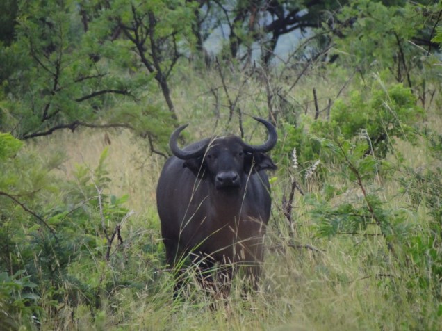 The heaviest downpour was beginning to subside, but new ponds and torrents of water blocked our progress into the park. We tried several different paths only to be turned around when the water became too deep to wade through. On foot, the bush takes on a whole new character and your senses are heightened with every sound and every movement in your periphery. We didn’t really expect to see any wildlife (or rather hoped we wouldn’t), but it was a unique experience to gain such an intimate perspective of the bushveld. Just before our time was up, we came upon a herd of Cape Buffalo. The Cape Buffalo maintains its place in Africa’s Big Five, but in my opinion, they are the least exciting one to see from a safari vehicle. Barely more than big mean cows, I’ve never been overwhelmed with spotting one, but from the ground and eye-level…that’s intense! I held my breath when the closest bull stopped grazing and stared us down, this gangly group of noisy humans. There’s no sneaking up on anyone when you’re wearing waterproof pants! The bull quickly decided we were too ridiculous to be dangerous and went back to chewing cud.