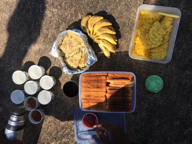 Mel said she had never been hiking before so Jill and I encouraged her along to the top of our route, where our guide unpacked cheese sandwiches, pineapple, omelette, and baby bananas for us to share for breakfast. From a metal thermos, he poured steaming cups of chai. It was idyllic and hard to imagine the cacophony of city noises from so far out here.