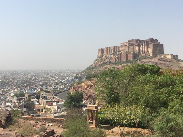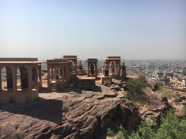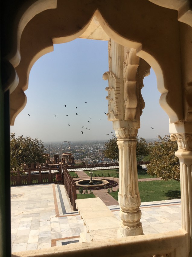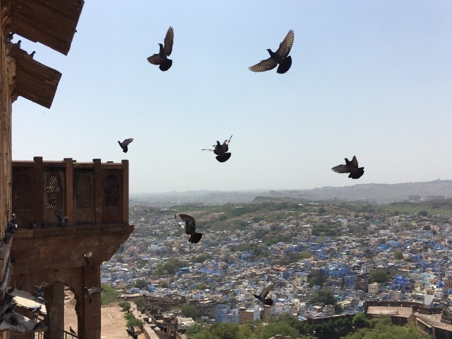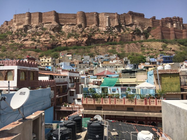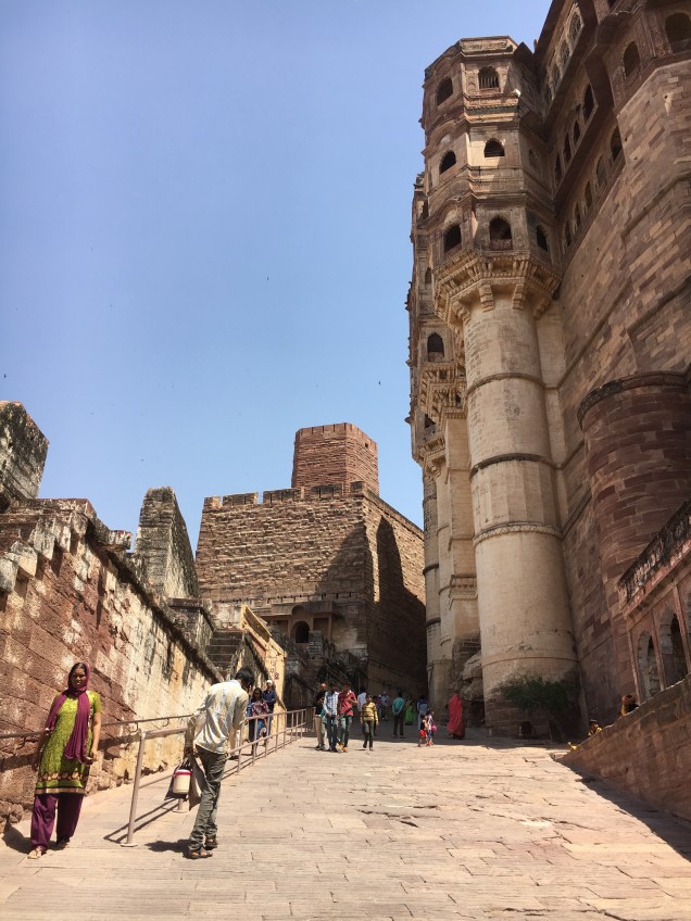 It was early, not even 8am. My bed was not ready, but I was told I could take breakfast on the rooftop terrace. The terrace, located on the 4th floor, opened up to a breathtaking view of Jodhpur’s crown jewel, Mehrangarh Fort, and the sprawling Blue City was laid out before me in the morning light. I met Beccy from the UK who was the only other early-riser and she joined me for a climb up to the fort where the calming reverential silence was in contrast to the crowded alleys below. Only a few other tourists roamed the marble hallways, but it seemed the main attraction was the view way off to the hazy horizon of the azure-accented neighborhoods.
