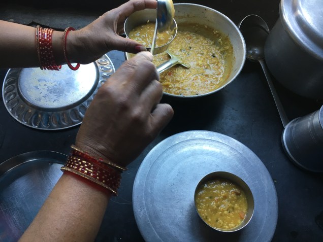At one point, an elderly man shuffled in, his bare feet sliding across the floor. He walked to our pot of dal, still simmering on the stove, grabbed a long wooden spoon and took a handsome helping before turning to shuffle back the way he had come. Mamta swatted at him as he left the room. Amused and a little confused by this, Donal and I looked at each other and started laughing. Mamta explained it was her husband and I almost caught a look of exasperation on her face.